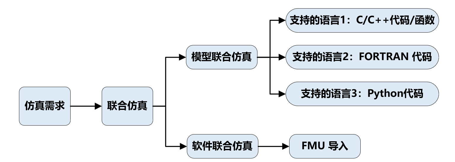 具体工作流程从仿真需求出发,集成不同模块或不同领域模型联合仿真,根据不同编程语言、求解器、仿真软件对联合仿真部分的功能开放程度不同,将联合仿真分为以下 2 个方面进行介绍。