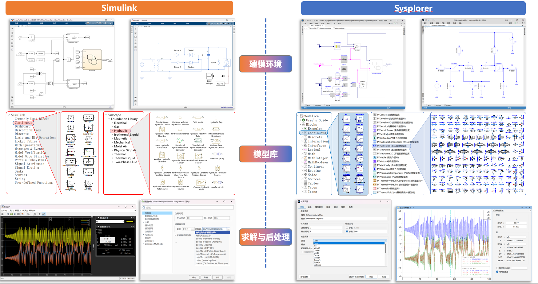 Sysplorer 建模环境为国产化产品,具有高度的自主性,并且从页面设计、参数面板显示及帮助文档等多方面相对于 Simulink 建模环境更符合国内用户的使用习惯,其次 Sysplorer 支持多领域统一建模,避免多工具切换。