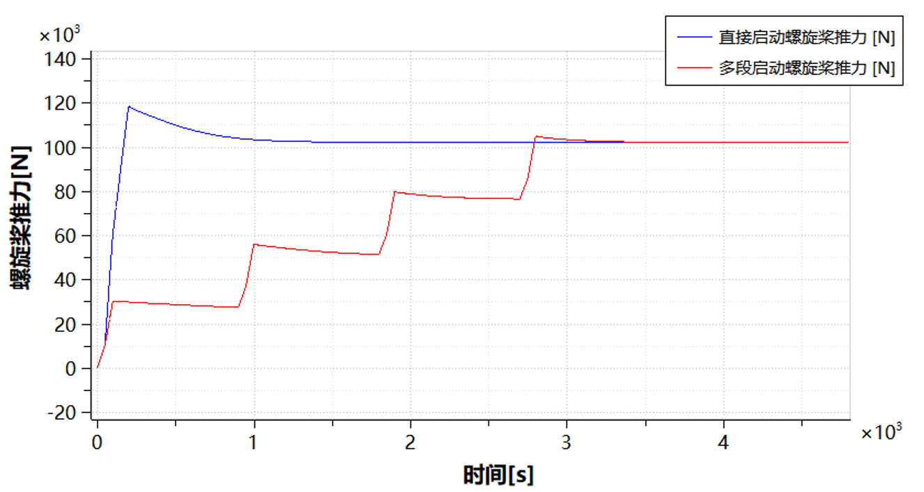 将船舶直接启动结果和分段启动结果进行对比,可以发现在 4 段分段启动后,单螺旋桨的峰值推力 104600 N 要小于直接启动的峰值推力 118000 N,采用分级启动的方式可以有效减小设备的瞬间过载所造成的不良影响。