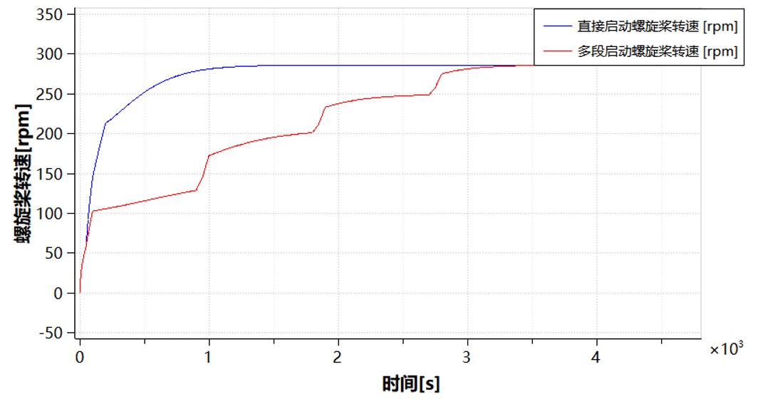 仿真案例可以有效的模拟双机双桨船舶的运行状态。模拟不同启动状态下(直接启动、多段启动)的船舶和螺旋桨参数;