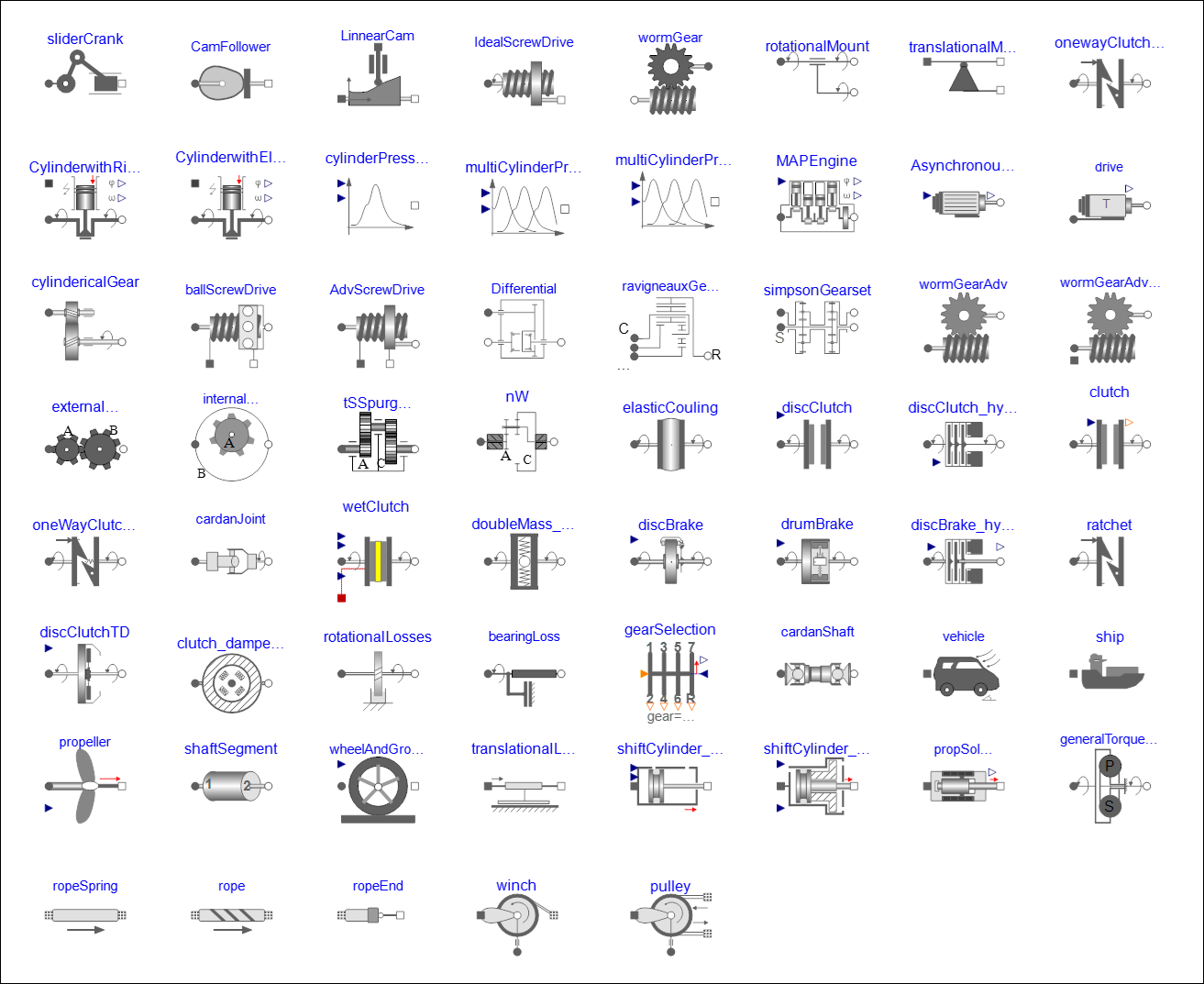 | CouplingElements | 连接器 | 提供常用传动连接器和离合器模型,包含弹性联轴器、压盘式离合器、湿式离合器、单向离合器等模型 |