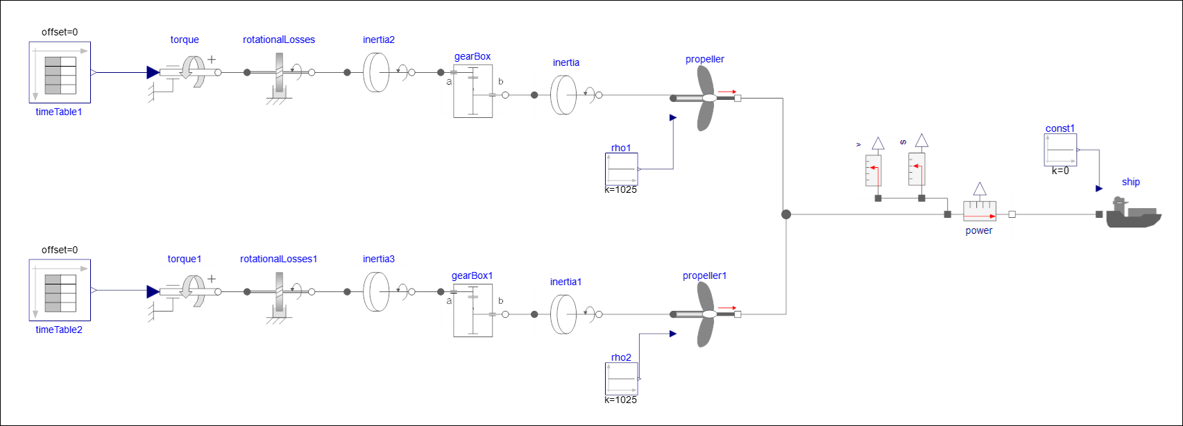 船舶电力驱动系统是使用电动机作为动力装置,将电能转化为机械能,从而推动船舶前进的船舶动力系统。下方案例中的系统模型是一套双机双桨布置的电力驱动船舶动力装置模型,在此模型中通过扭矩源替代传动电机作为船舶动力,设置传动轴系的传动比,以及螺旋桨和船身模型和其他模型的参数,完成系统模型设置。该系统模型可以通过调整输入两个发动机的输入扭矩来控制船舶航行状态,评估螺旋桨转速和推力。仿真结论如下: