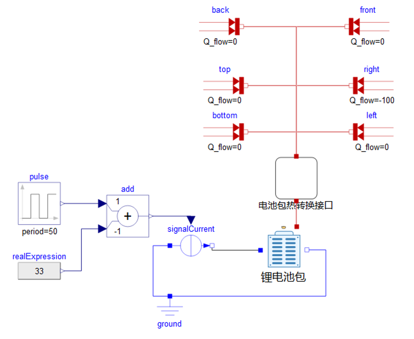 锂电池包模型定义了 N 个模组串并联的方式,定义模组之间的连接关系,同时将模组模型与电池包外壳的热模型进行预连接。一般由多个电池模组集合而成,锂电池包两端口连接用电设备正负极,负责存储和释放能量,为汽车或电器设备提供动力。锂电池包模型由模组外壳、电池模组模型等模型构成。该电池包被外部电流负载以循环脉冲方式给入,以模拟电池包对外部电流负载的响应,可以仿真内部产热和外部环境的热交换性能。