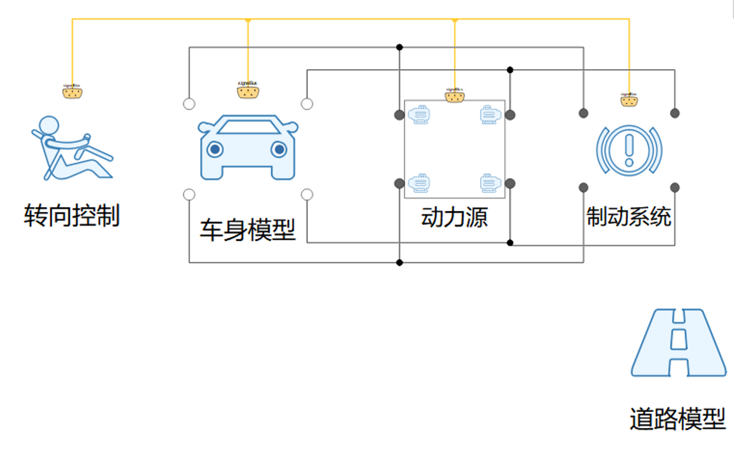 模型库包括 7 自由度整车,14 自由度整车并 KC 悬架、多体悬架架构下的高复杂度整车动力学模型,可以快速进行整车系统设计,悬架性能分析以及车辆纵向加减速、后轮转向、横向操纵稳定性等工况的测试与验证,同时也支持用户自定义调用纵向控制、横向控制及悬架控制等相关接口,便于验证整车动力学相关的控制策略。