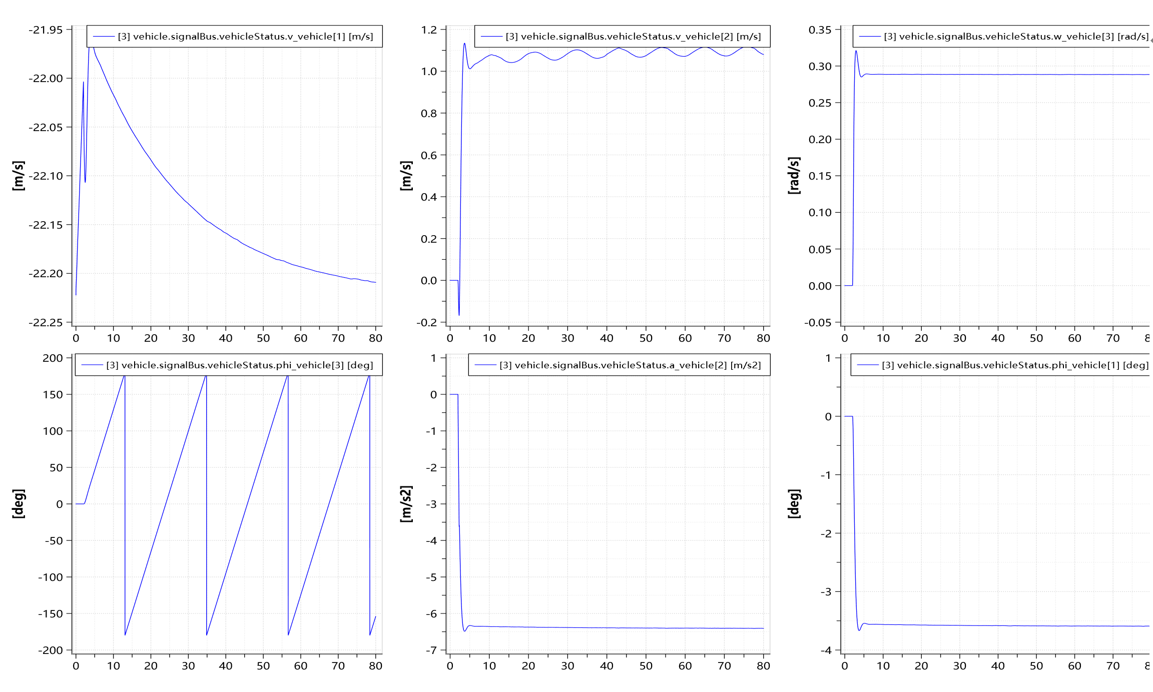 整车工况有常见的驾驶性工况和转向操稳工况,如阶跃转向,稳态转向,避障工况等。可以结合动力性经济性的传动系统,配合多体模型车身实现复杂的驾驶性仿真能力。
