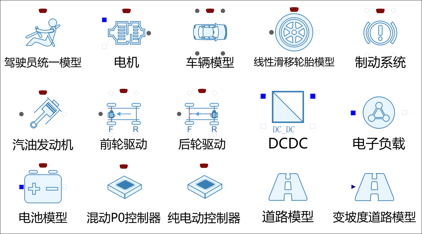 为满足车辆动力性经济性仿真分析、能量管理策略分析、驾驶性策略分析,提供车辆动力型经济性模型库,本模型库旨在通过提供车辆传动系统模型、驾驶员策略模型和纵向行驶车辆模型构建包含多种动力总成架构的车辆架构,实现不同架构车辆的典型工况分析,以支持动力总成架构定义选型、整车控制策略闭环分析、纵向工况驾驶性分析等仿真场景。