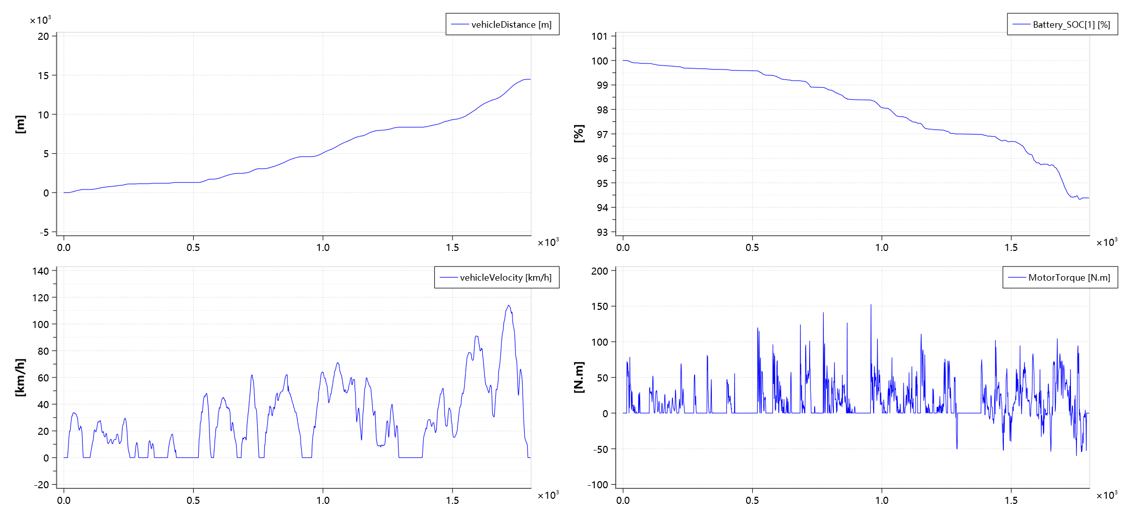 下图分别为行驶距离、电池 SOC、车速、电机扭矩: