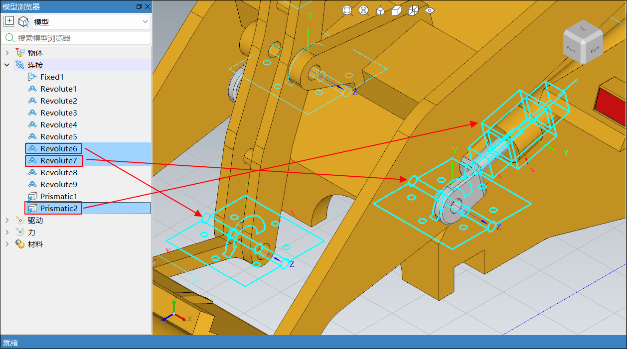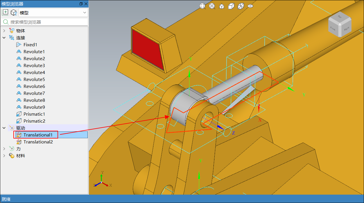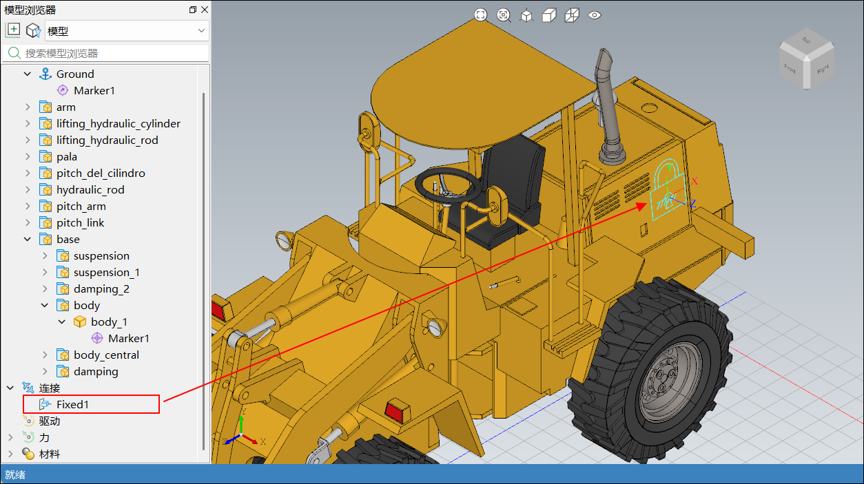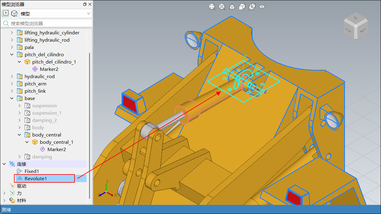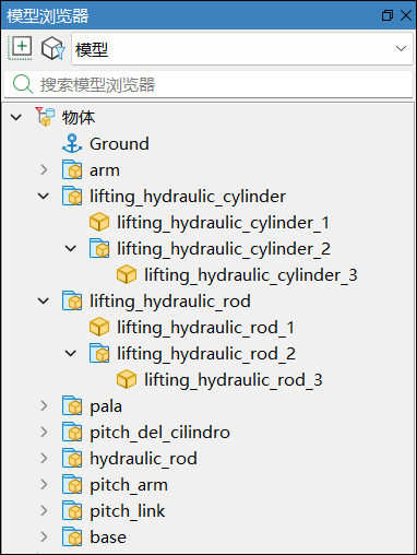 在模型浏览器中选中模型后,通过鼠标左键拖拽节点,将升降液压缸