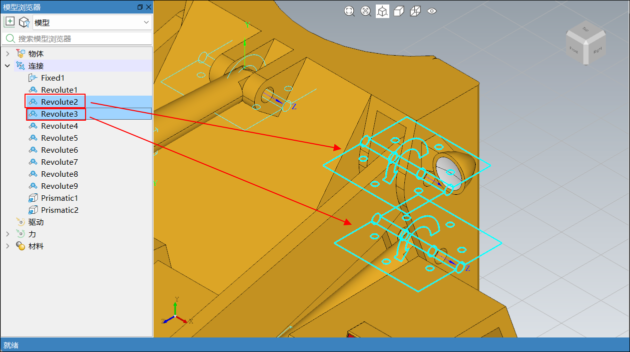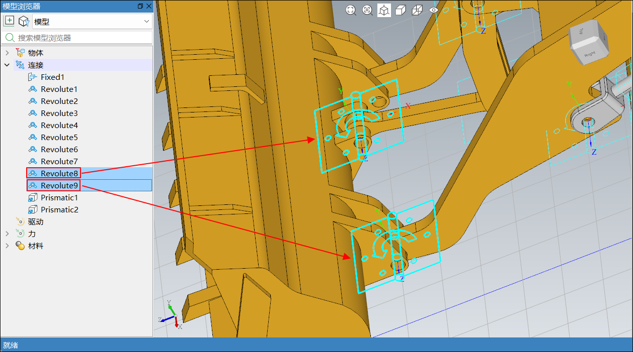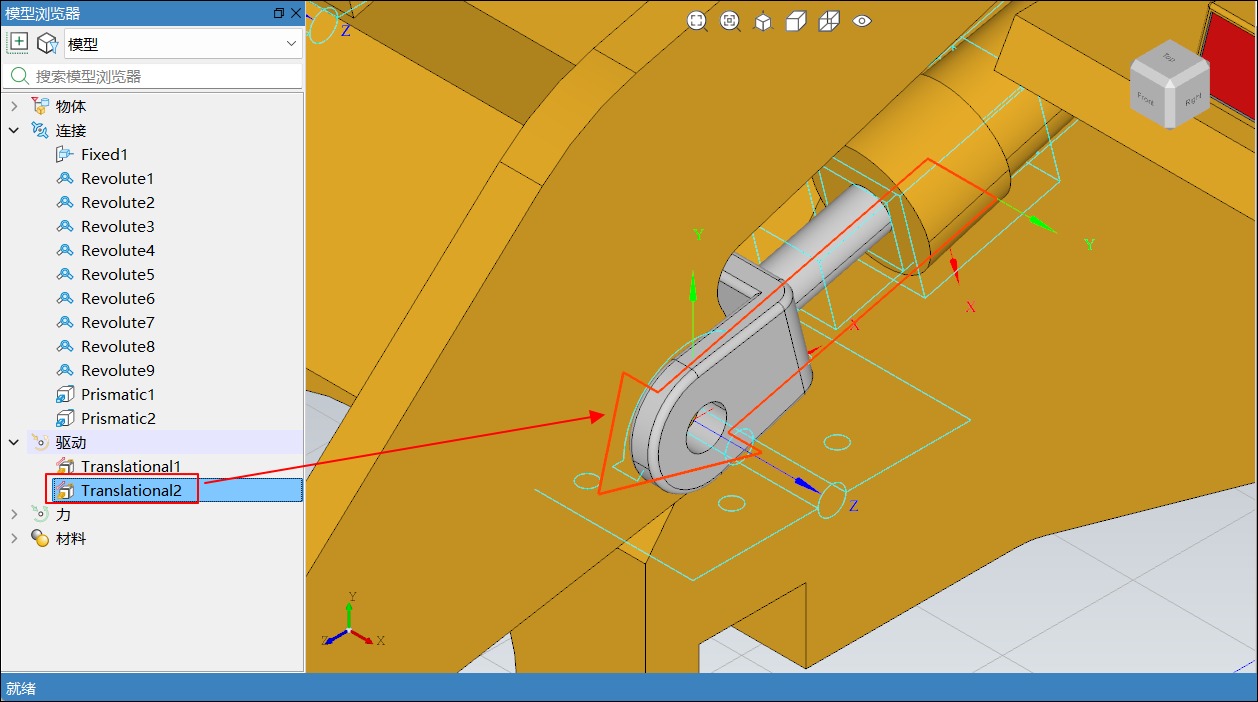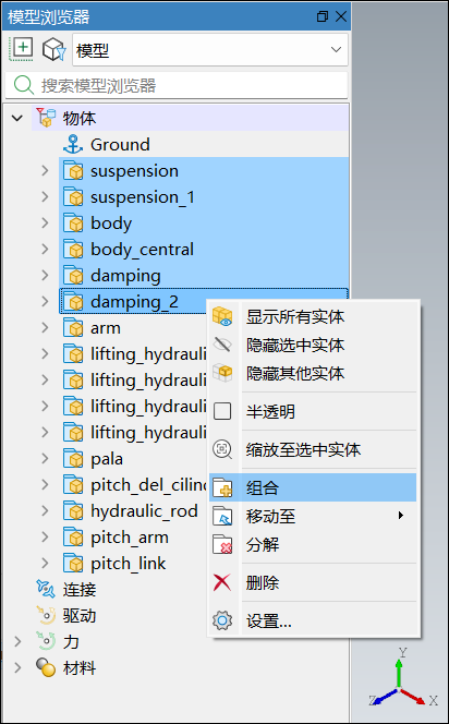 在模型浏览器中选中模型后,通过鼠标左键拖拽节点,将升降液压缸