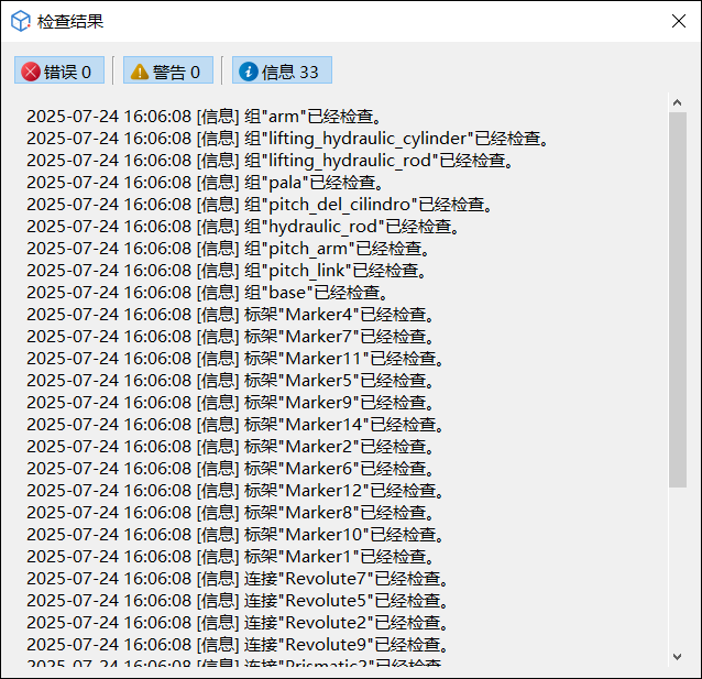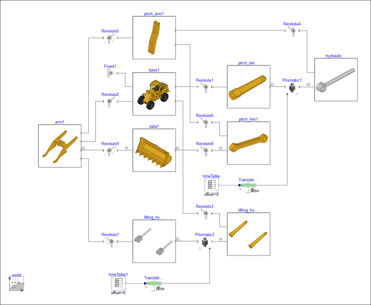 连接名称 连接类型 零件1 零件2 Revolute2 转动副 arm_1 body_central_1 Revolute3 转动副 lifting_hydraulic_cylinder_1 body_central_1 Revolute4 转动副 hydraulic_rod_1 pitch_arm_1 Revolute5 转动副 arm_1 pitch_arm_1 Revolute6 转动副 pitch_link_1 pitch_arm_1 Revolute7 转动副 lifting_hydraulic_rod_1 arm_1 Revolute8 转动副 pitch_link_1 pala_1 Revolute9 转动副 arm_1 pala_1 Prismatic1 平移副 hydraulic_rod_1 pitch_del_cilindro_1 Prismatic2 平移副 lifting_hydraulic_rod_1 lifting_hydraulic_cylinder_1