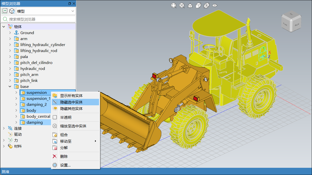 base下除body_central_1之外的所有分组,右击,在弹出的上下文菜单中选择隐藏选中实体,将选择的零件隐藏,便于添加连接;