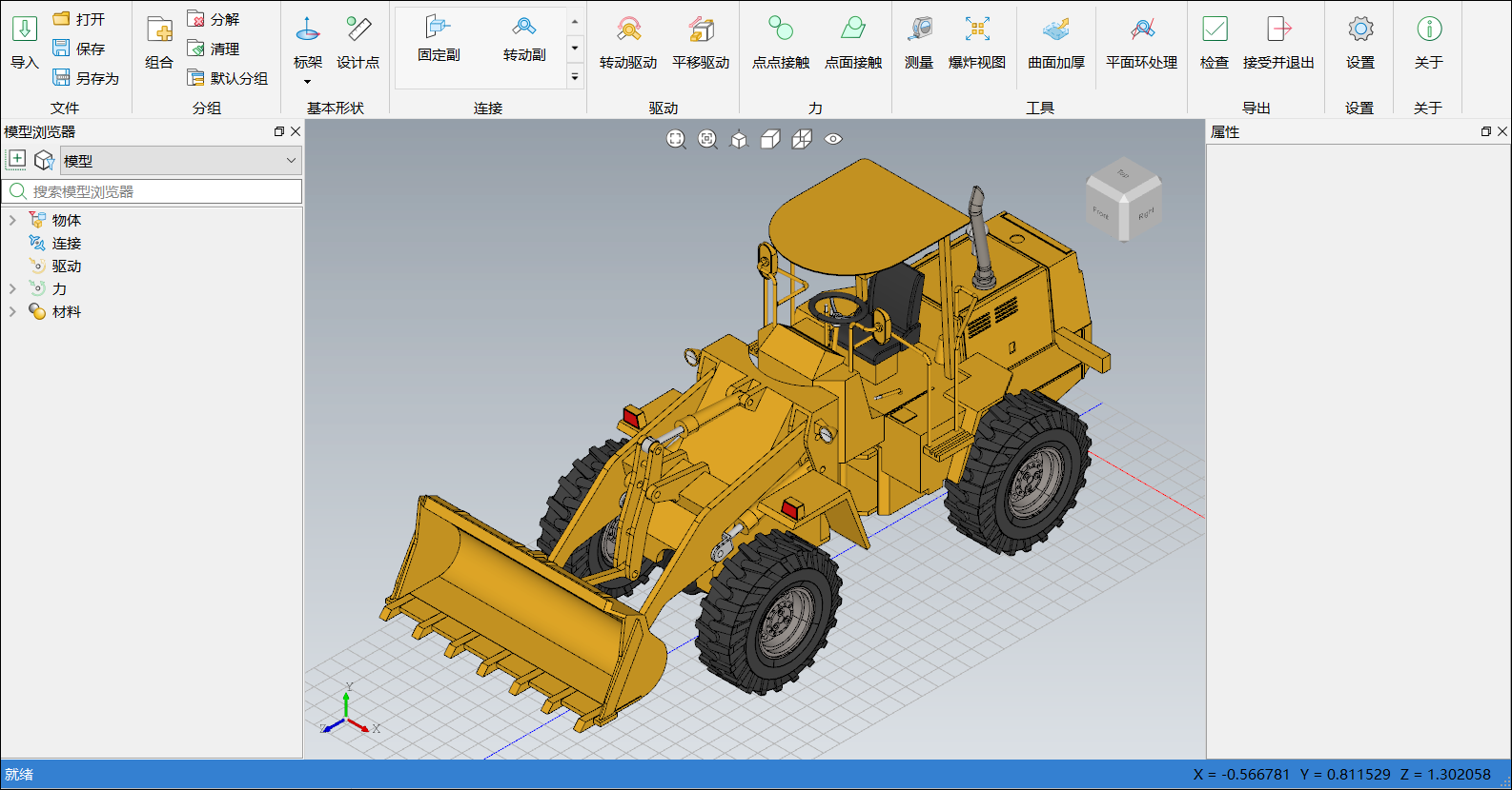 完成分组、添加连接和添加驱动等多体设计后,即可将其转换为 Sysplorer 支持的 Modelica 多体模型,进行后续的多体建模操作。