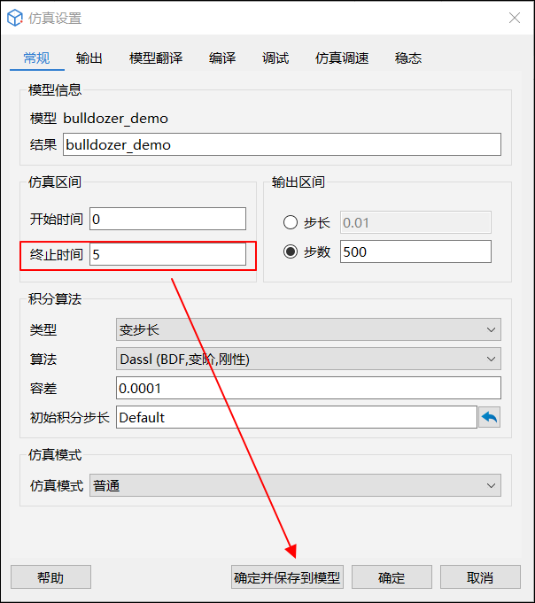 单击主页 > 仿真设置,将仿真区间中的终止时间设置为