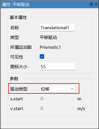驱动添加完毕后,在模型浏览器或三维视图中选中驱动,在右侧弹出的属性-平移驱动侧边栏中,修改驱动类型为位移,