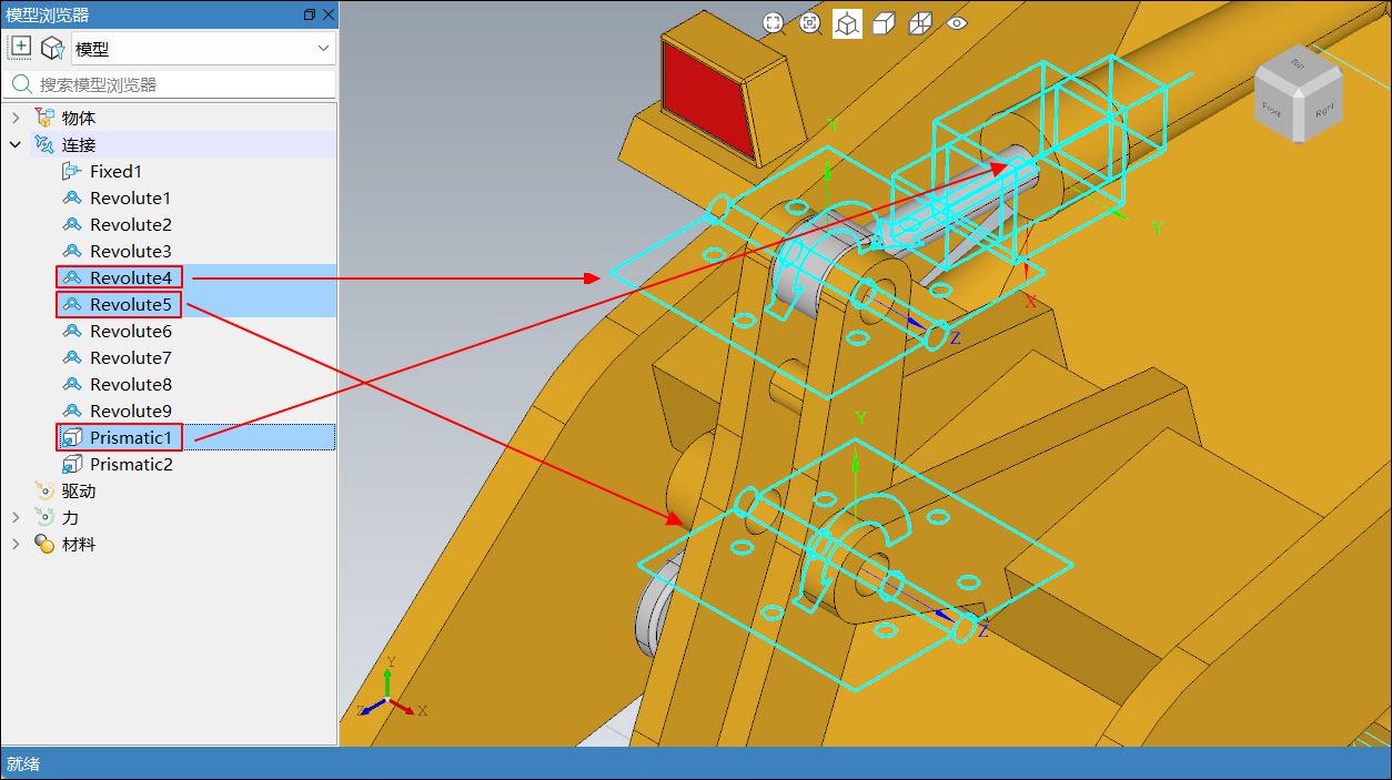 连接添加完毕后,按 Esc 键,退出添加连接状态,然后按照下表中的信息,在对应运动副上添加驱动;