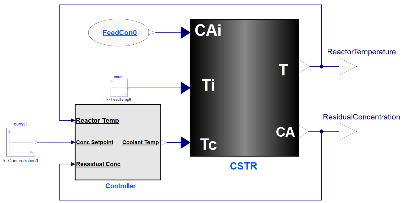 : CSTR 反应器中 A 物质的浓度,单位 ; : 进料中 A 物质的浓度,单位 ; : CSTR 反应器中的温度,单位 ; : 进料的温度,单位 ; : 冷却水的温度,单位 ; : 体积流量,单位 ; : CSTR 中物质的密度,单位 ; : CSTR 的高度,单位 ; : CSTR 的加热横截面积,单位 ; : 反应 的前指数因子,单位 ; : 反应 的活化能,单位 ; : 反应 的反应热, ; : 玻尔兹曼气体常数, ; : 热熔, ; : 热传递系数, 。