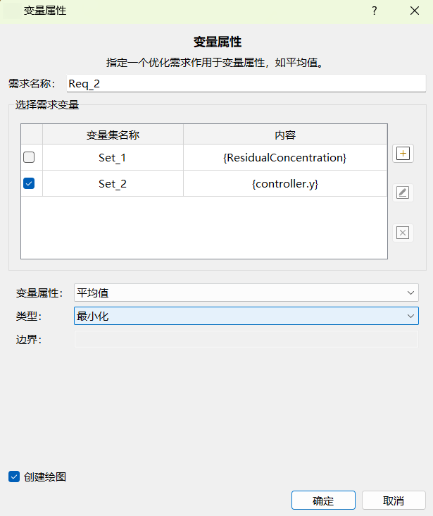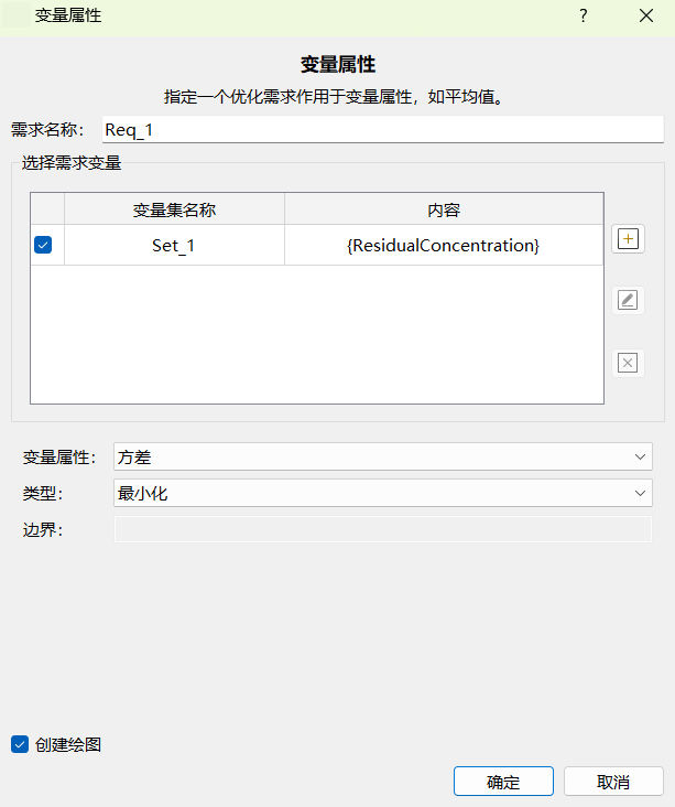 单击新建需求图标,选择变量属性需求,并按照以下要求设置需求属性。- 在选择需求变量功能区域单击添加按钮,选择 ResidualConcentration 作为该需求的输出变量(左侧蓝色勾选框会默认选中当前创建的变量集);