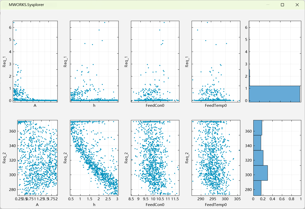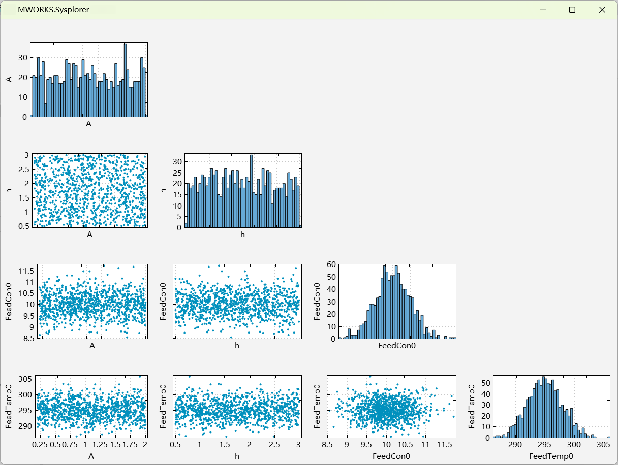 另外你还可以在数据浏览器中选中上一步中生成的参数集的名称(ParamSet),然后在敏感度分析顶部的工具栏中单击绘图>散点图绘制所有参数的采样数据直方图与散点图(如下图所示)。