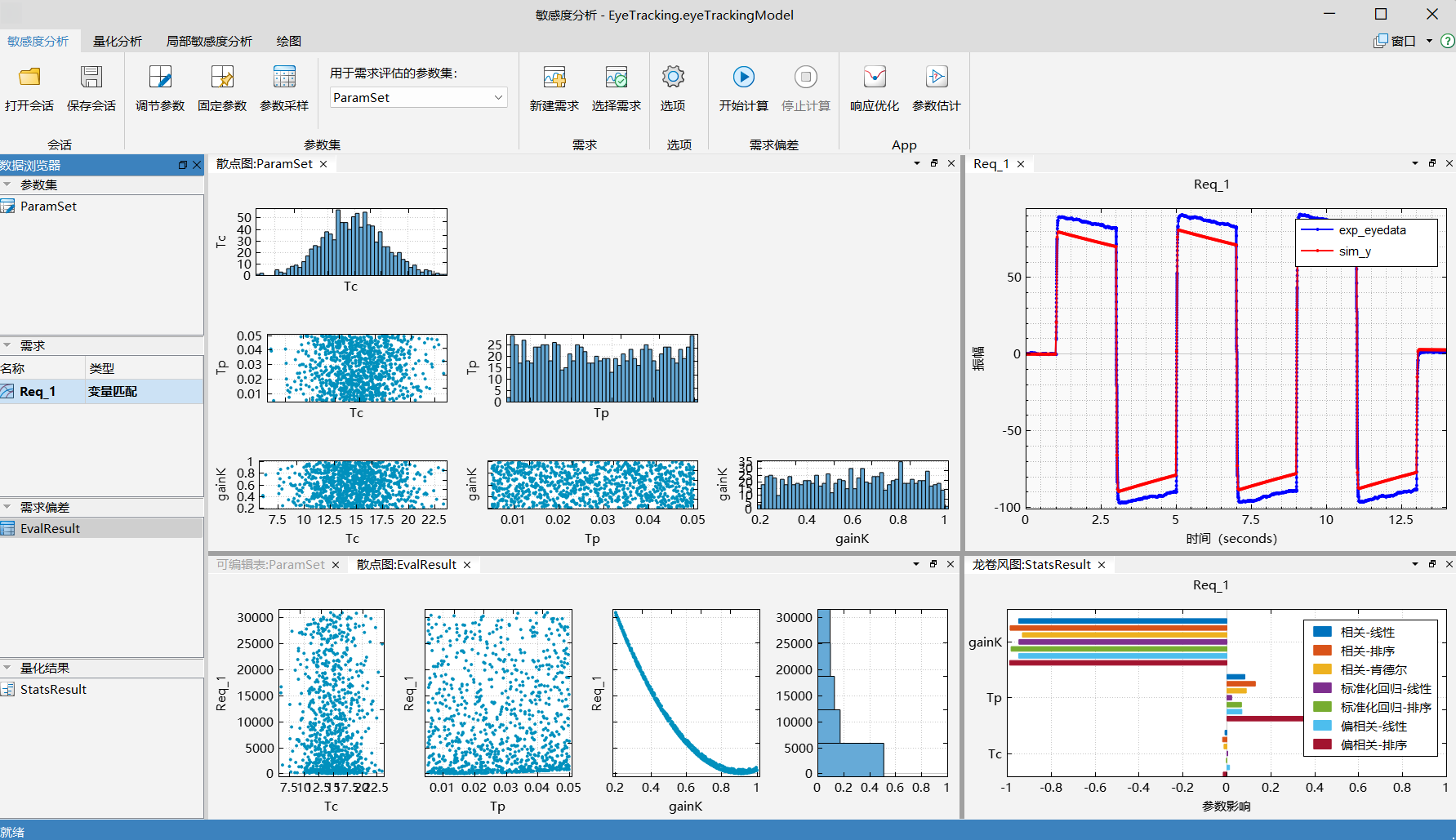 | ③ | 中央视图区 | 显示敏感度分析过程中的散点图、统计分析图和龙卷风视图等 |
