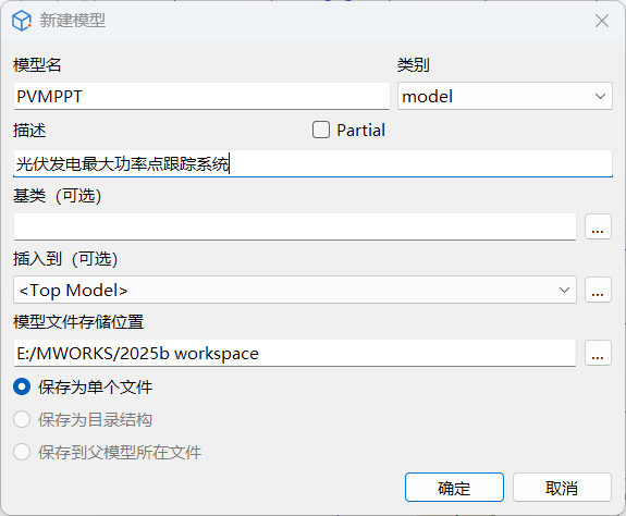 PVMPPT,描述为光伏发电最大功率点跟踪系统。选择模型文件存储位置后,单击确定,完成模型创建。