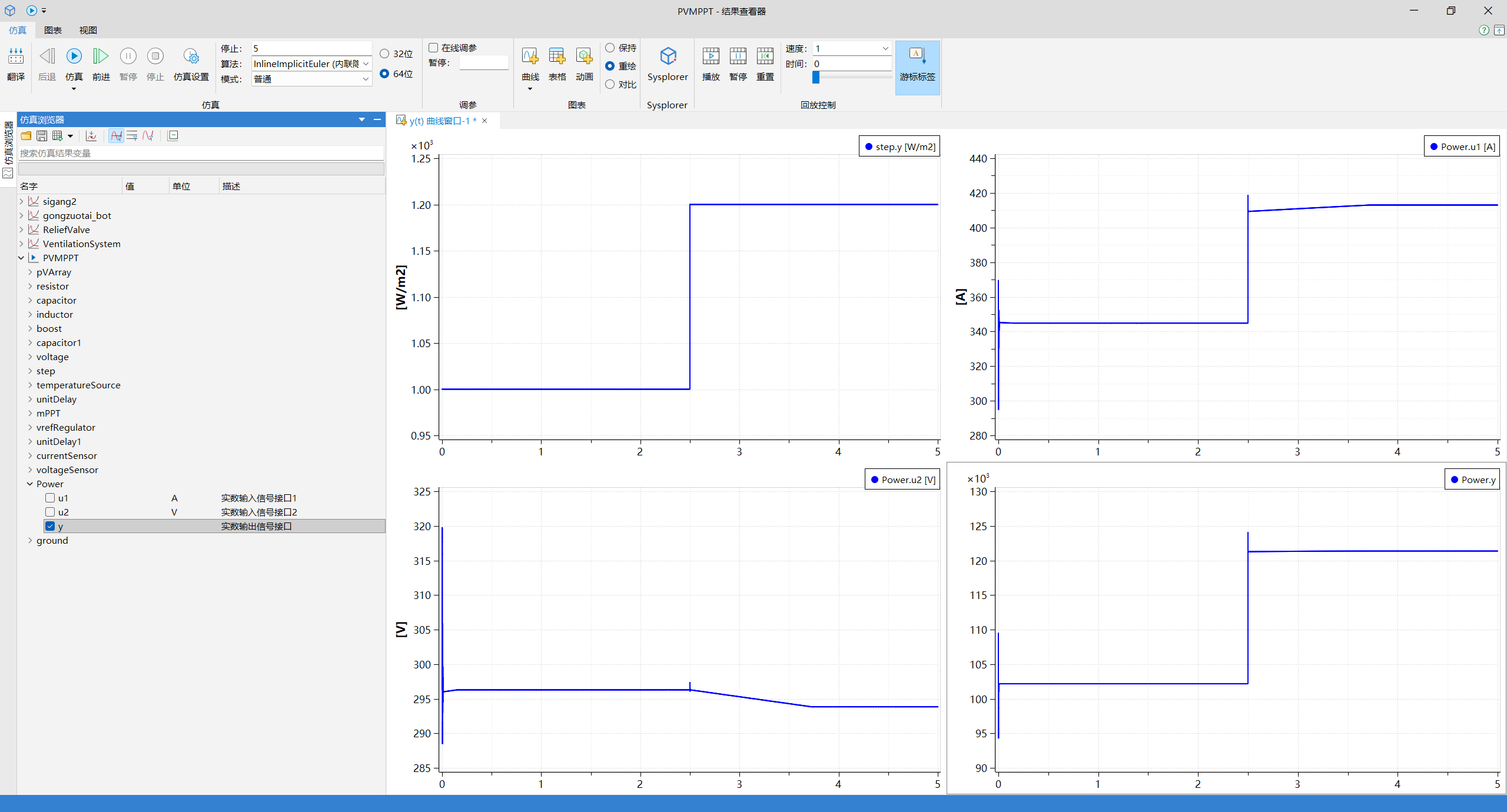 以光伏发电最大功率点跟踪系统为例,在 0~5 秒内仿真,光照强度输入在 2.5 s 从 1000 w/m2 增加到 1200 w/m2,光伏发电系统的电流电压和功率同步提高,实现光伏发电跟踪功能。