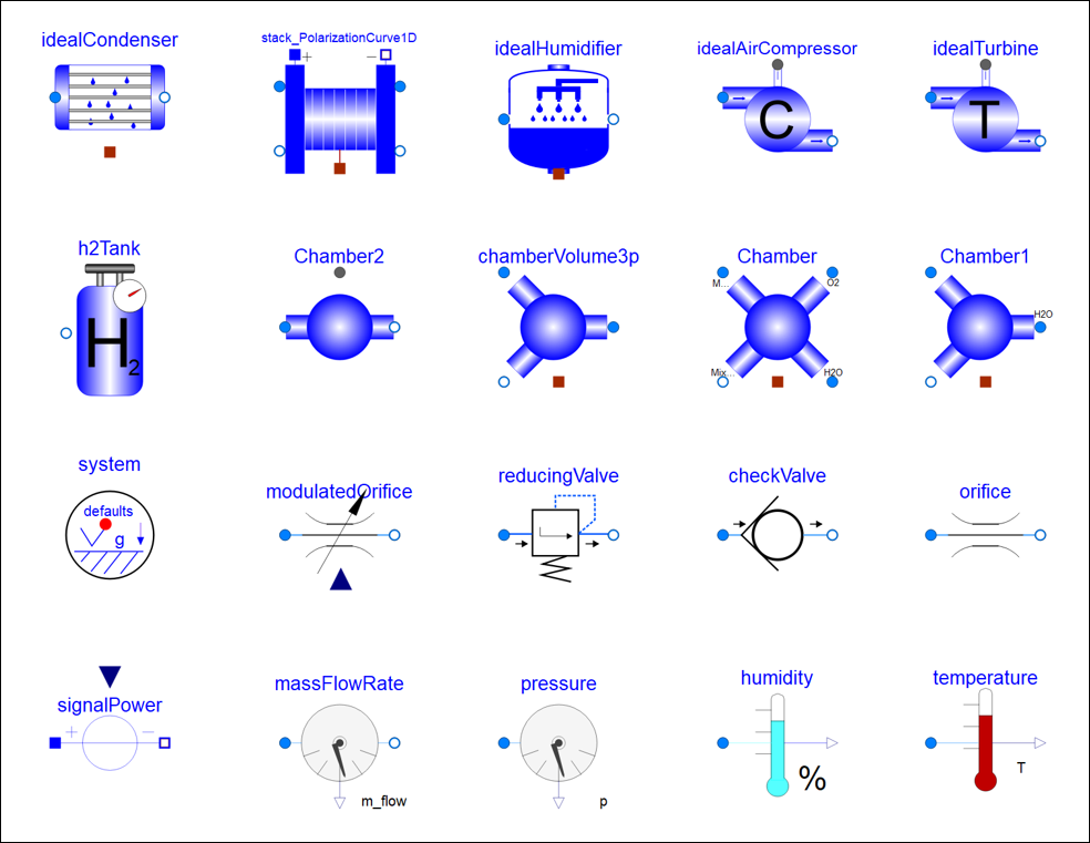 | Accessories | 附件库 | 提供燃料电池系统的附件,如热交换器,氢气循环泵,冷凝器等 |