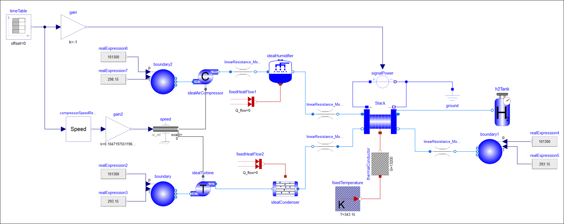 燃料电池系统模型库提供了质子交换膜燃料电池系统构成所需的零部件模型,如电堆、散热器、换热器、水泵、空气压缩机、加湿器等模型,能够实现电堆内部状态参数的监测,开展燃料电池系统的仿真分析和设计验证。
