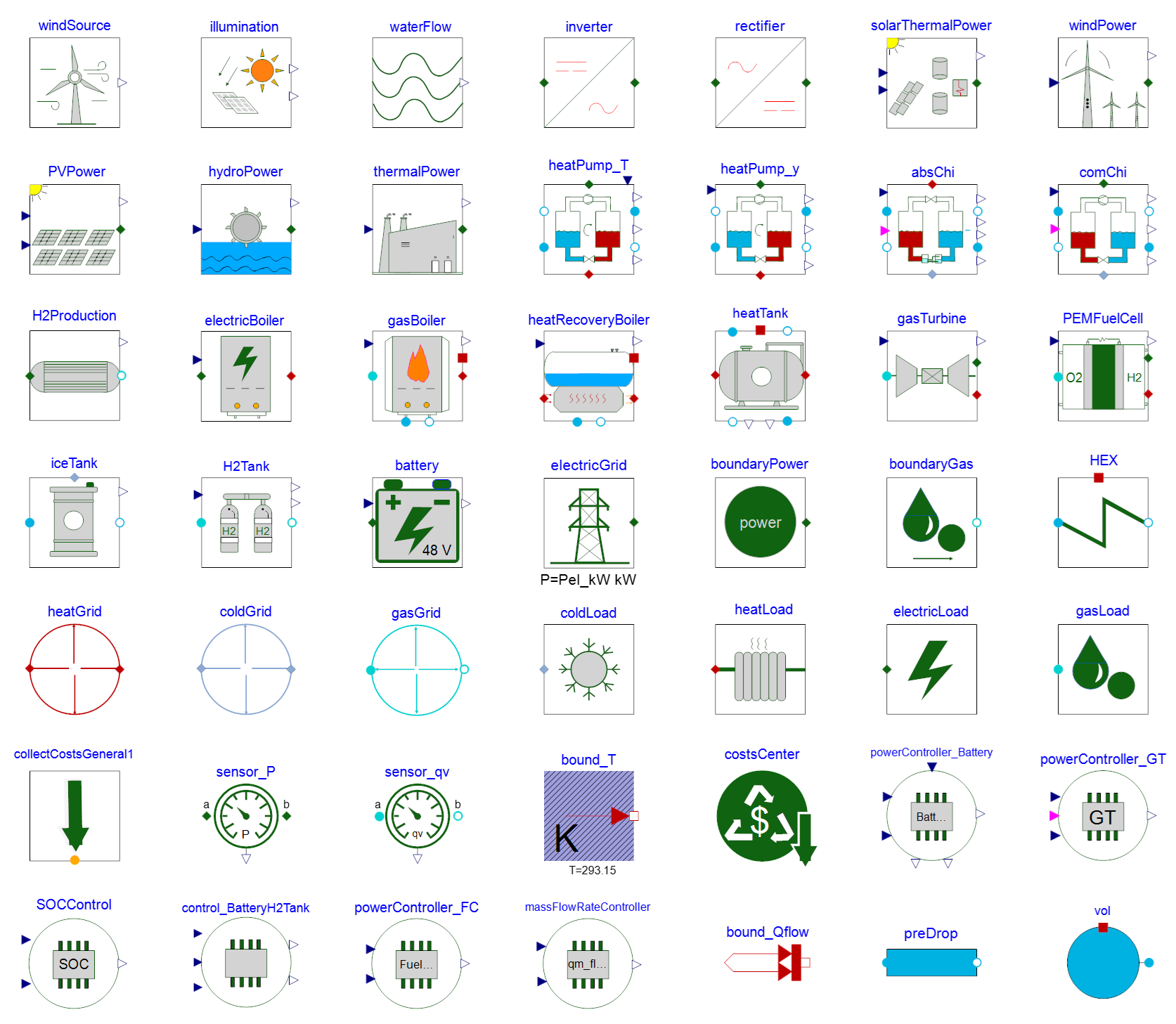 | EnergySource | 能源生产设备库 | 提供了风力发电、光伏发电、水力发电、火力发电、光热发电和电解制氢系统 |