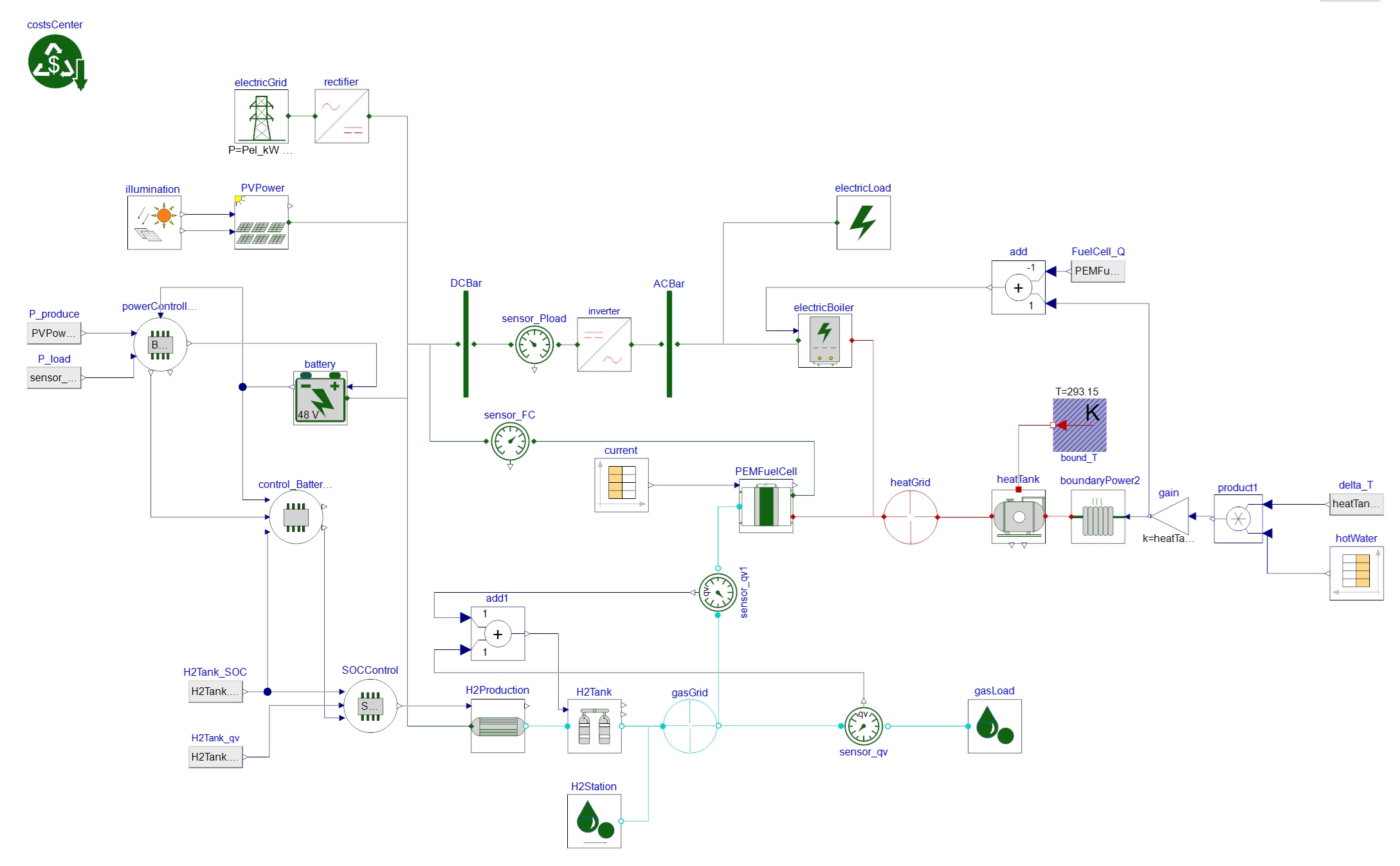 TYIntegratedEnergySys 综合能源系统模型库提供了包含电、热、冷、气多能源形式的生产、转换、传输、储存、消耗设备,主要包括:风力发电系统、光伏发电系统、电解制氢系统、热泵、锅炉、制冷机、蓄电池等设备模型,覆盖了综合能源系统常用的典型实例。该模型库支持综合能源系统的运行状态模拟、运行优化、设备选型等,且支持区域级多能源系统规划与耦合仿真。