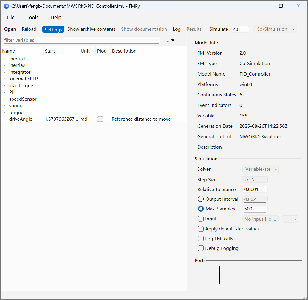 在 FMPy 中进行仿真时,FMU 以独立单体方式运行,其输入与输出信号不会与外部环境交互,主要用于验证 FMU 内部行为。