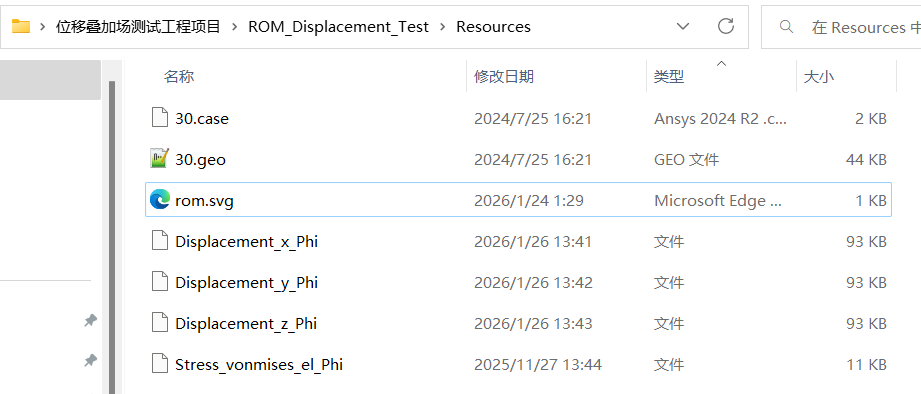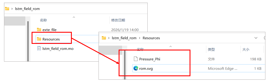 若场导入数据形式为case,导出模型的 Resources 文件夹中,除rom.svg图标外,还存在*.case文件、*.geo(*.geom)与Phi文件,其中Phi文件的命名方式应为降阶时所选变量名+下划线+Phi,导出案例如下: