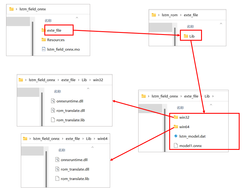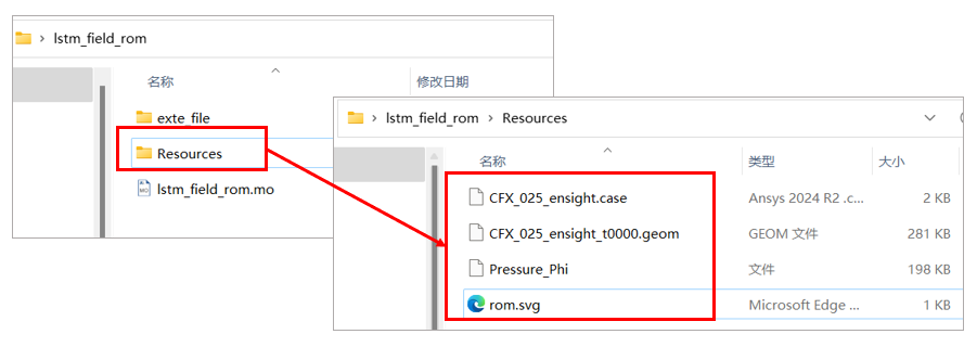 ONNX 导出文件中,关于系统数据与场数据的区别与 DLL 导出的区别相同,即场模型 ONNX 导出的 Resouces 文件中会存在*.case,*.geo以及Phi文件,此处不做过多赘述;ONNX 与 DLL 在 exte_file 文件夹中,存储的内容存在区别,具体如下: