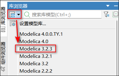 因新手入门中的模型使用 Modelica3.2.3 版本建立,请将 Sysplorer 主界面 Modelica 库版本修改为 3.2.3 ,否则在翻译模型时会翻译失败;