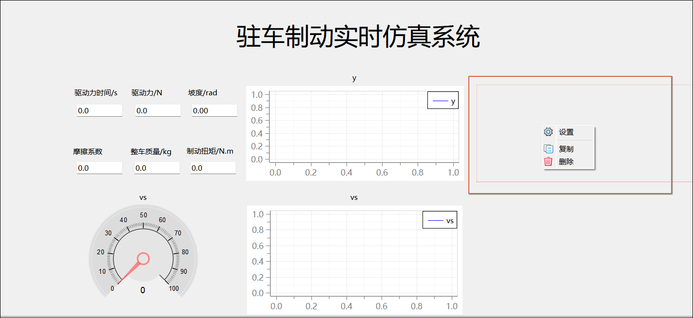 Gauge,拖入画布,双击该控件,选择 vs 变量进行绑定。选择两个控件chart,拖入画布,双击该控件,分别选择 y 和 vs 变量进行绑定。再拖入六个Spin Box控件,双击名称,按照下图名称进行修改,无需绑定值。具体绑定方式请参见组态界面设计。