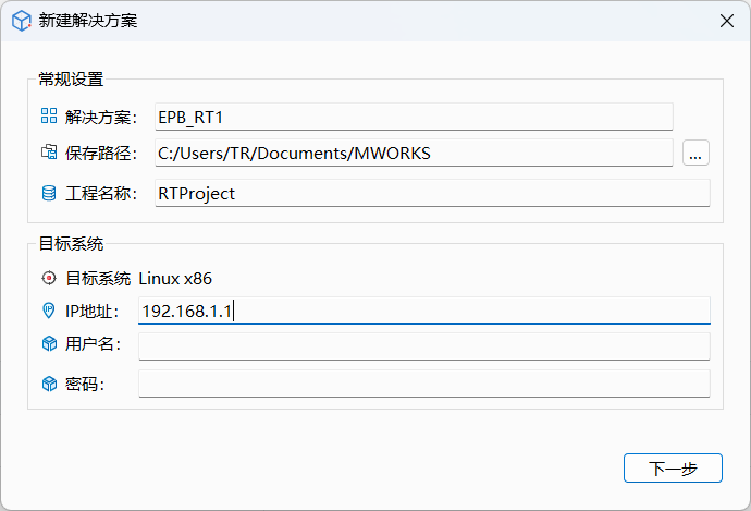 新建 EPB_RT 半物理模型解决方案,填写保存路径、工程名及目标机 IP 地址。
