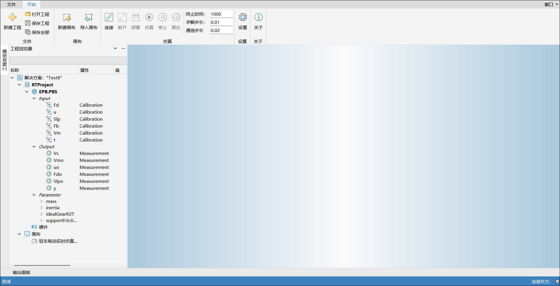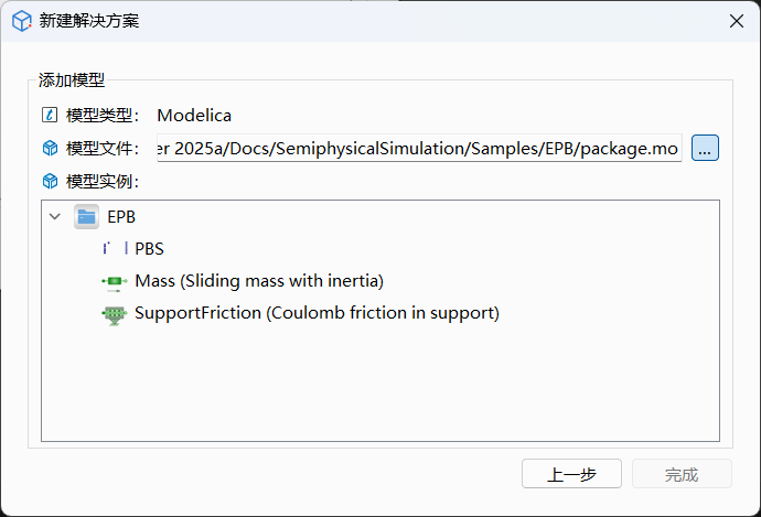 参数名 说明 值 模型文件 选择Sysplorer安装目录下 /Docs/SemiphysicalSimulation/Samples/EPB/package.mo的模型E:/MWORKS/Sysplorer 2024a_2425/Docs/SemiphysicalSimulation/Samples/EPB/package.mo模型实例 选择该模型实例 PBS 解决方案完成新建。
