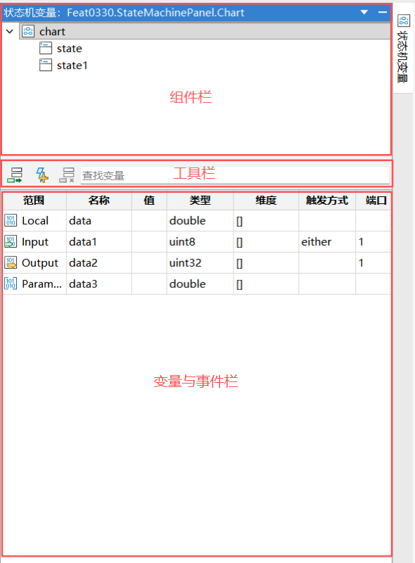 状态机变量管理界面分为对话框和面板两种形式,在管理界面定义状态机中使用到的所有变量,是状态机正常运行的基础。