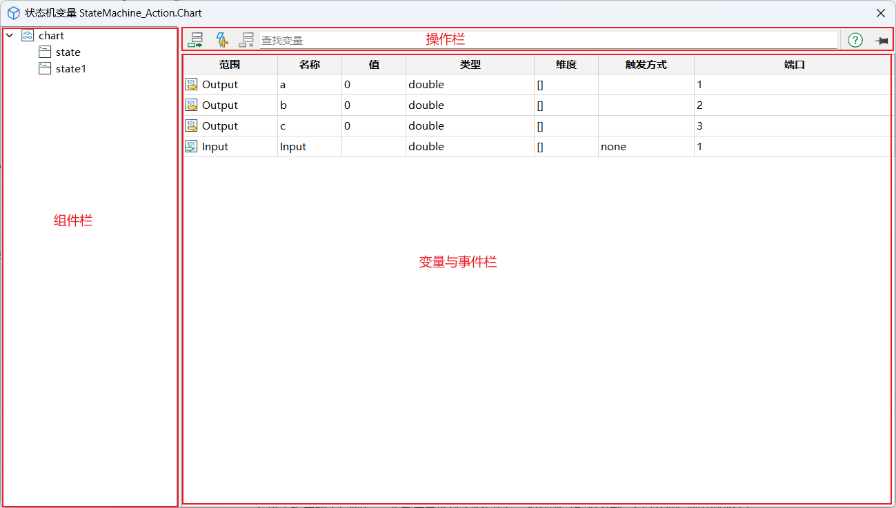 | 范围 | 指定变量的作用范围。 | - Input:输入变量,每定义一个输入变量,chart 模块就会多一个输入接口,并将输入端口接收到的数据赋值给对应的变量。 - Output:输出变量,每定义一个输出变量,chart 模块就会多一个输出接口,并将对应的变量以此端口输出。 - Parameter:参数变量,可以在整个模型(不局限于状态机)中使用。 - Constant:常数变量。 - Local:局部变量,只能在状态机中使用的变量。 |