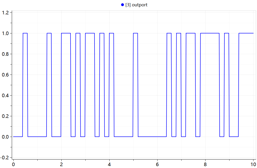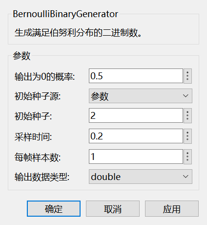 该模块的输出可以为标量,行向量,列向量或二维矩阵。输出信号中的行数对应一帧中的样本数,由参数“每帧样本数”决定;输出信号中的列数对应通道数,由参数“输出为 0 的概率”的元素个数所决定。