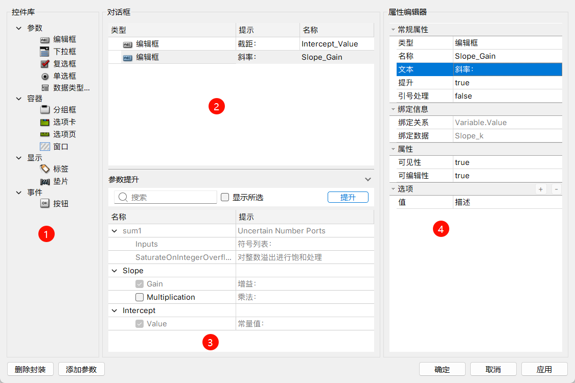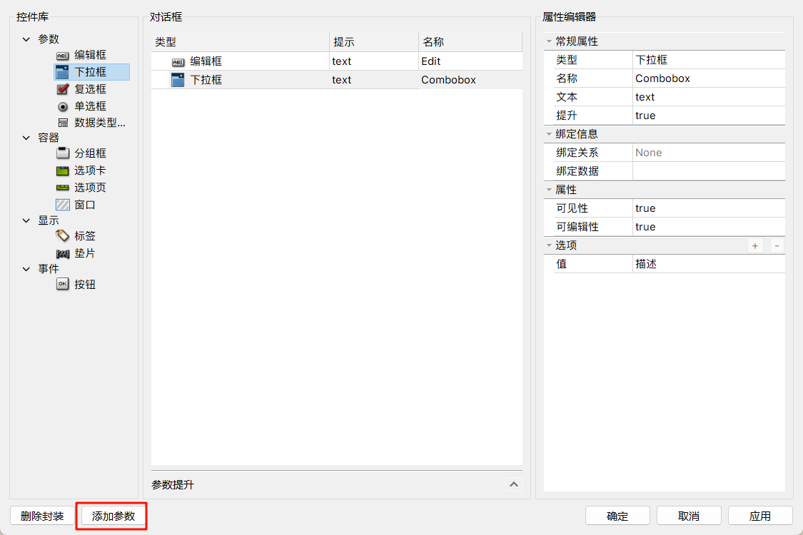 - 通过拖拽方式将控件添加到参数对话框,增强交互性。