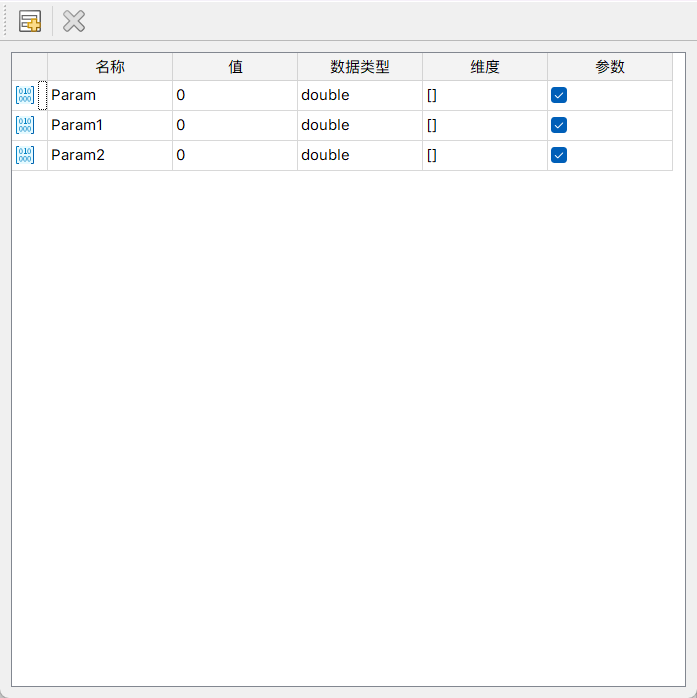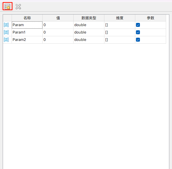 界面展示了参数列表,包括手动添加与提升的参数。并可对名称、值、数据类型、维度等信息进行编辑修改。