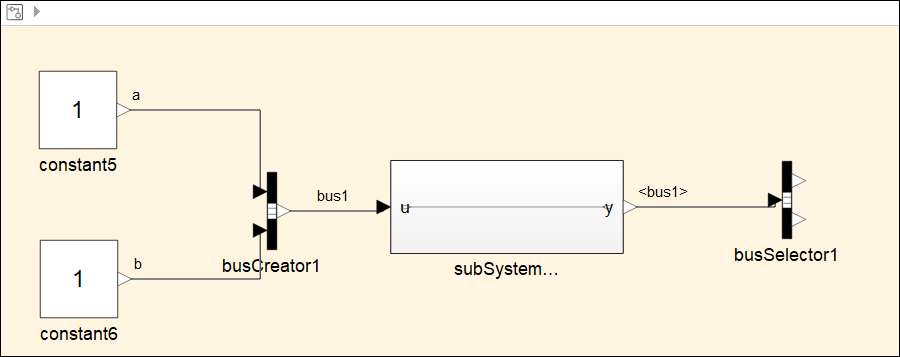 在下面的模型中,subSystem 模块输出信号的信号标签传播使用信号名称 bus1,这是 Bus Creator 模块的输出总线的名称。传播的信号标签不包含总线元素信号(a 和 b)的名称。