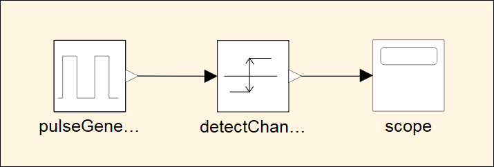 - Scope 模块:用于显示模型的输出。在这个例子中,它显示了变化检测的结果,即脉冲信号何时发生变化。
