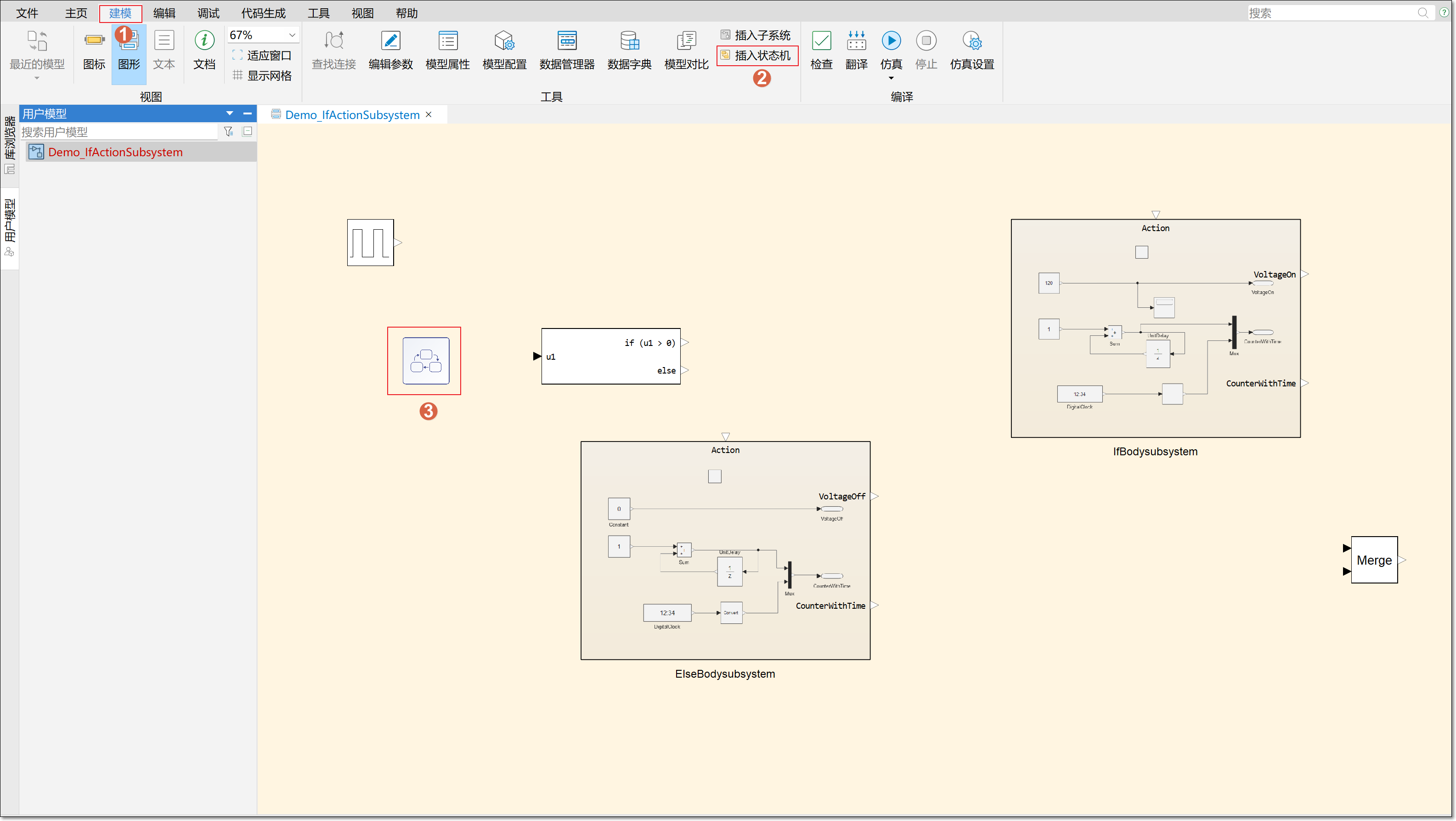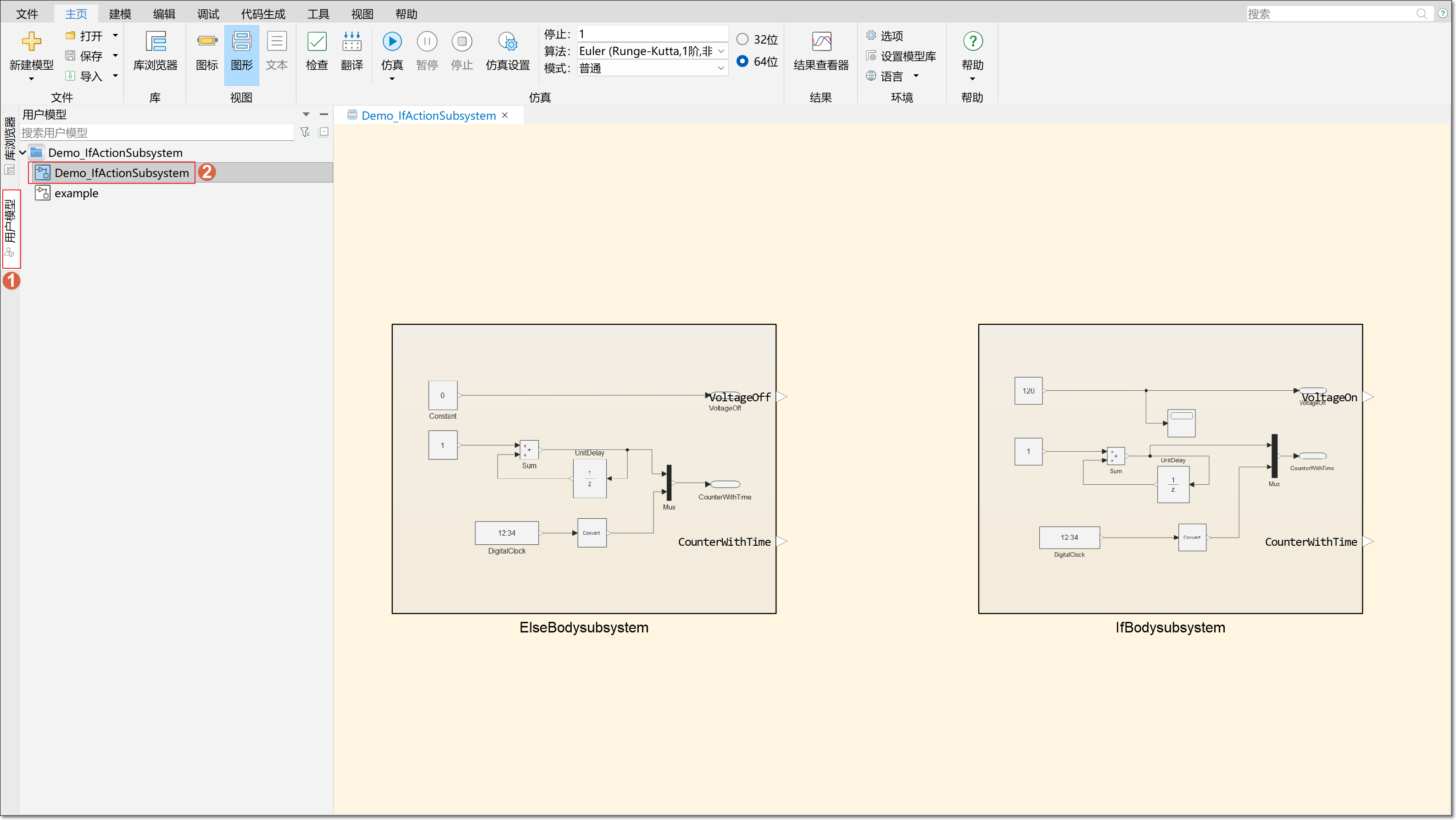 单击打开示例后,在 Sysblock 中单击用户模型找到 Demo_IfActionSubsystem 的示例,双击打开。