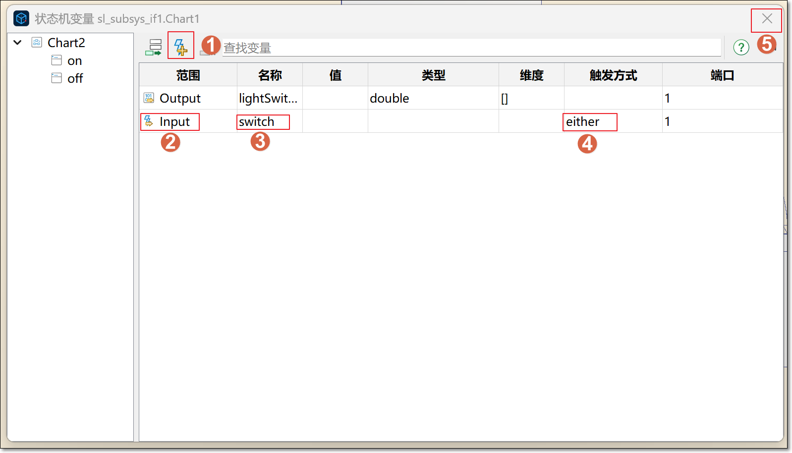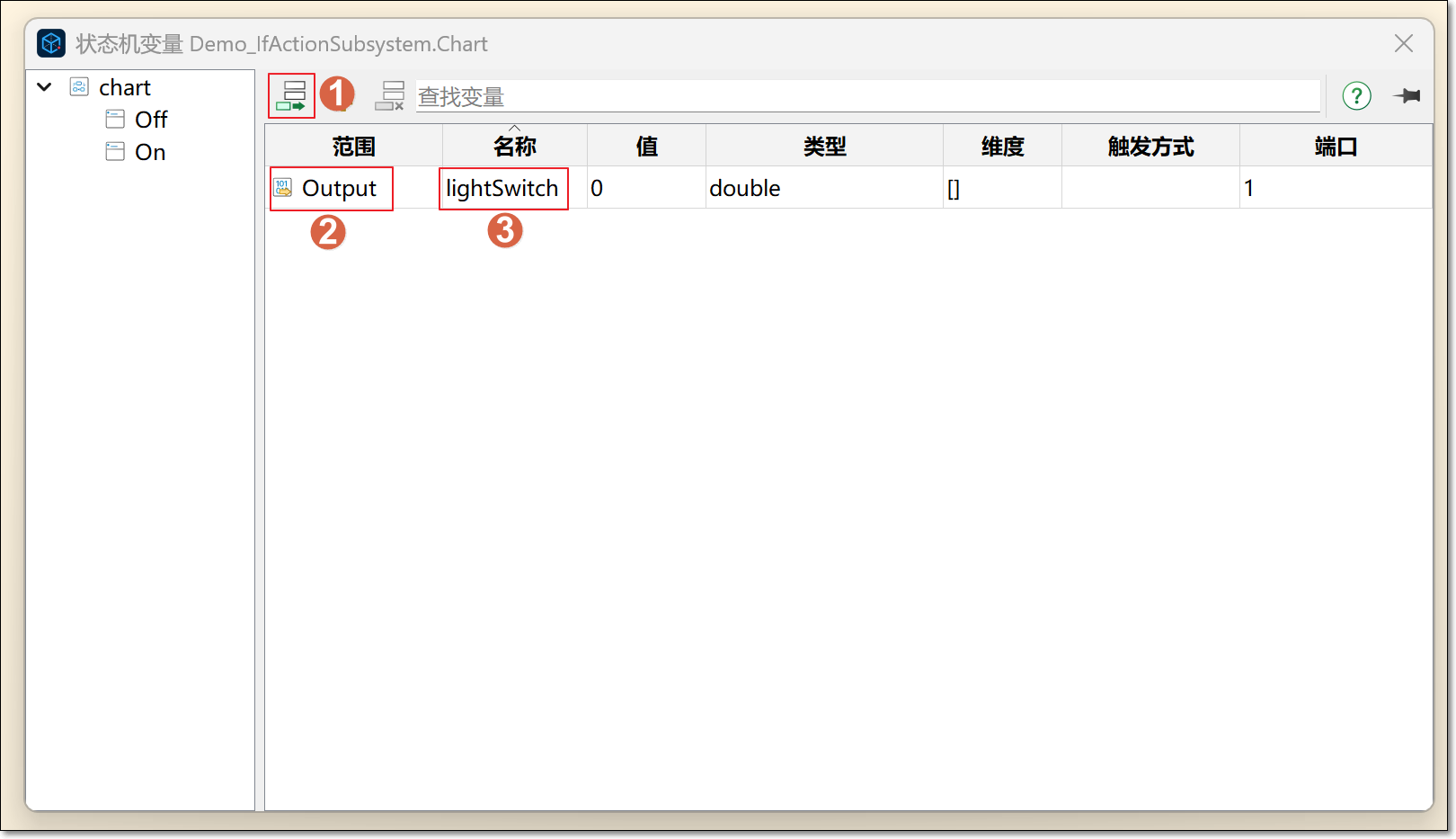 - 单击添加变量,将范围修改为 Output,名称修改为 lightSwitch。