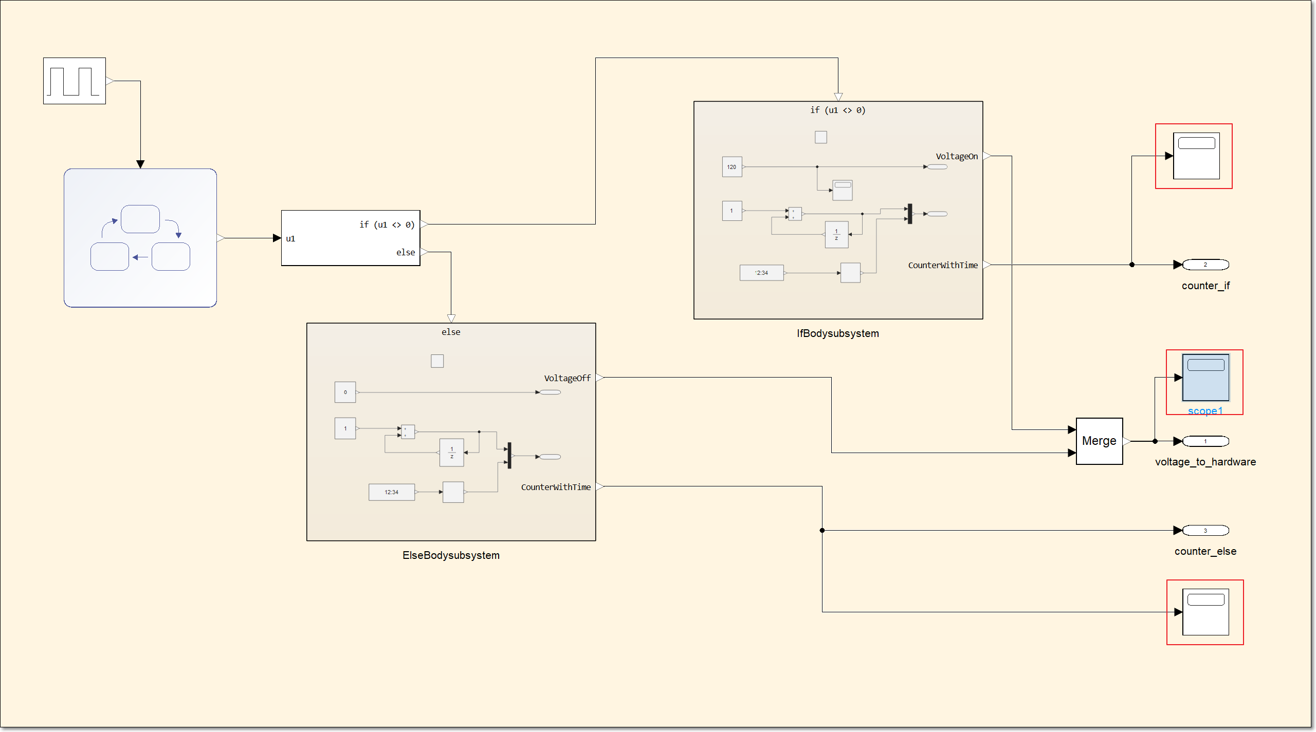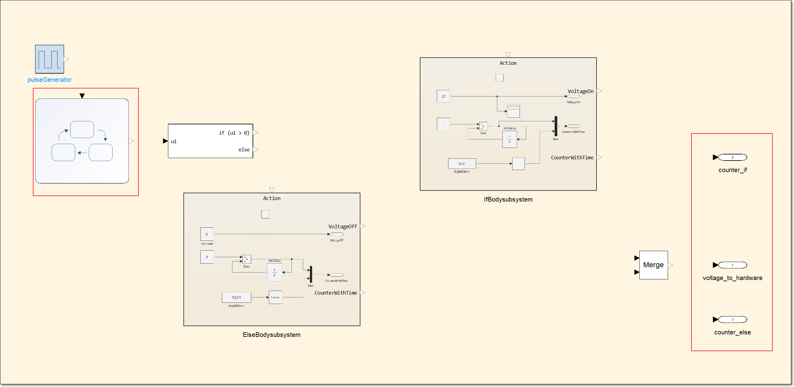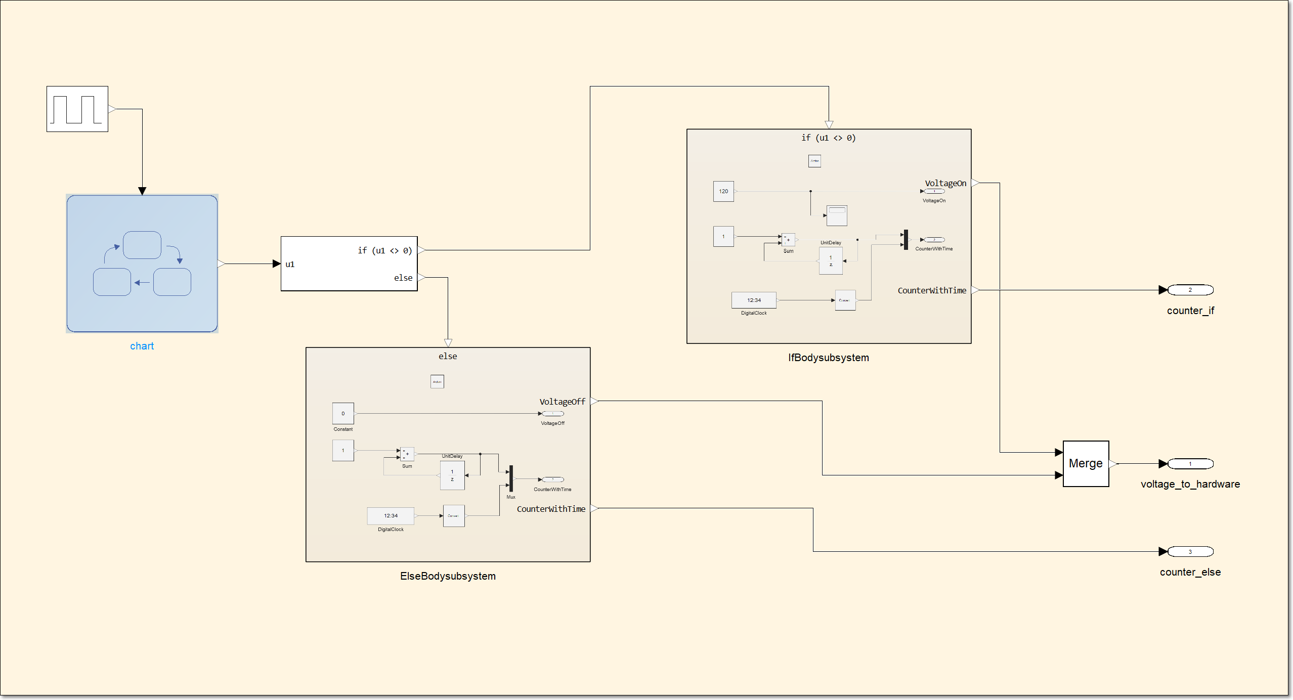 本示例展示了如何用状态机产生控制信号,并通过 If 模块选择性地激活不同的动作子系统:当 u1 为非零时开启电压并计数,否则关闭电压并计数。通过 merge 模块将分支输出统一到硬件端口,实现清晰高效的决策执行,同时便于统计各分支的运行次数。