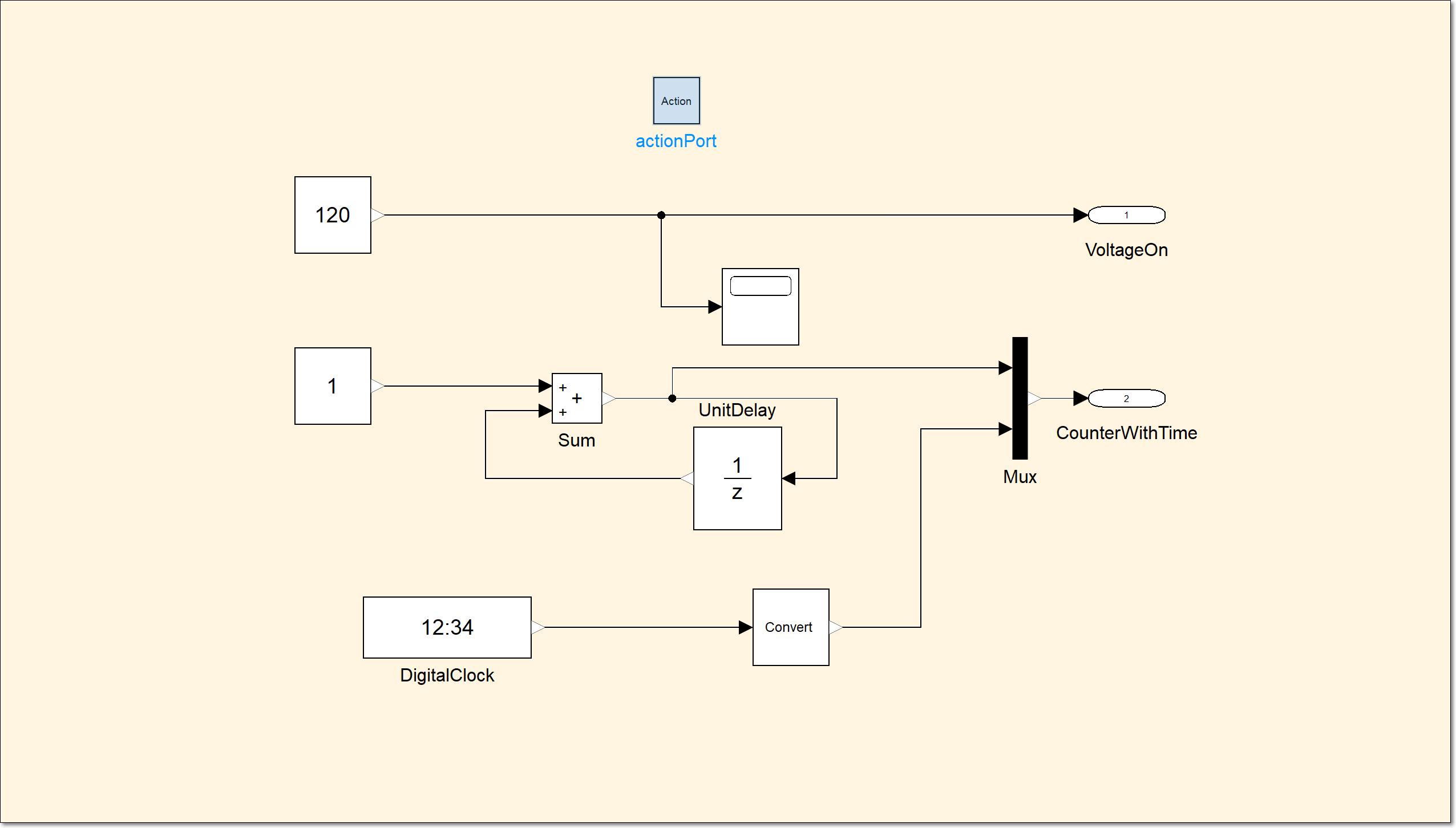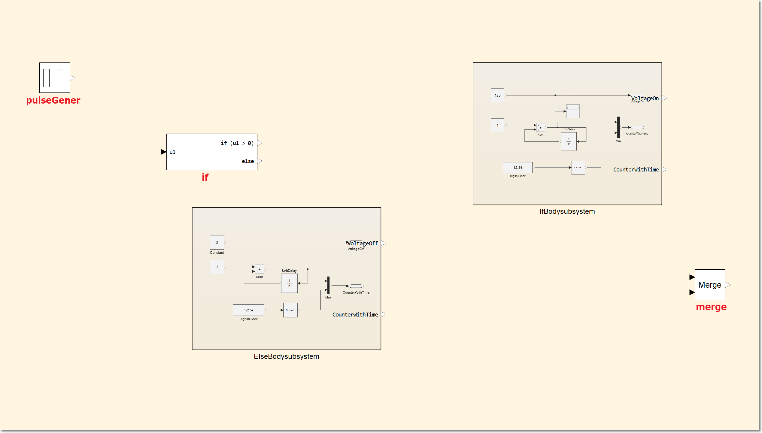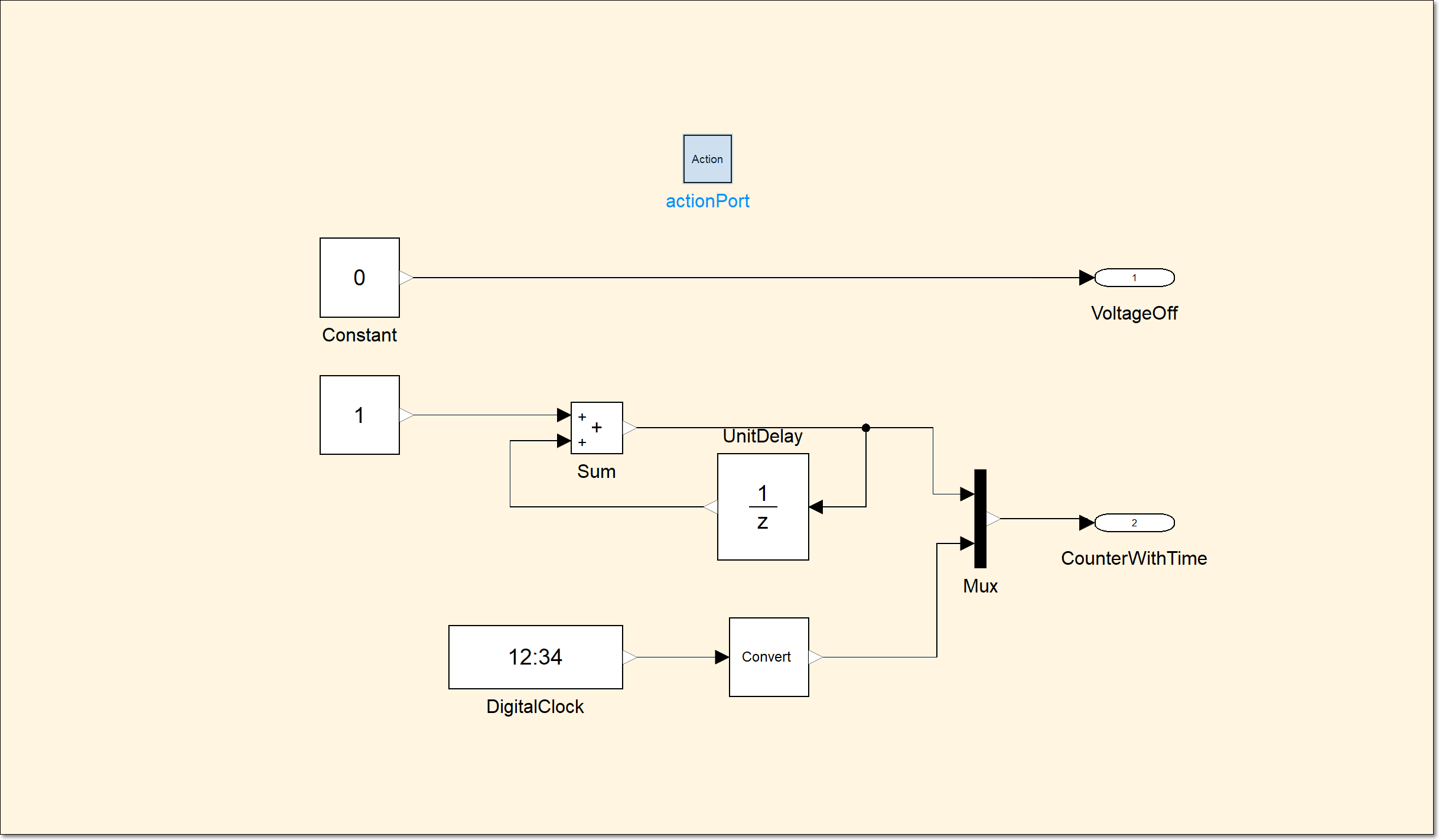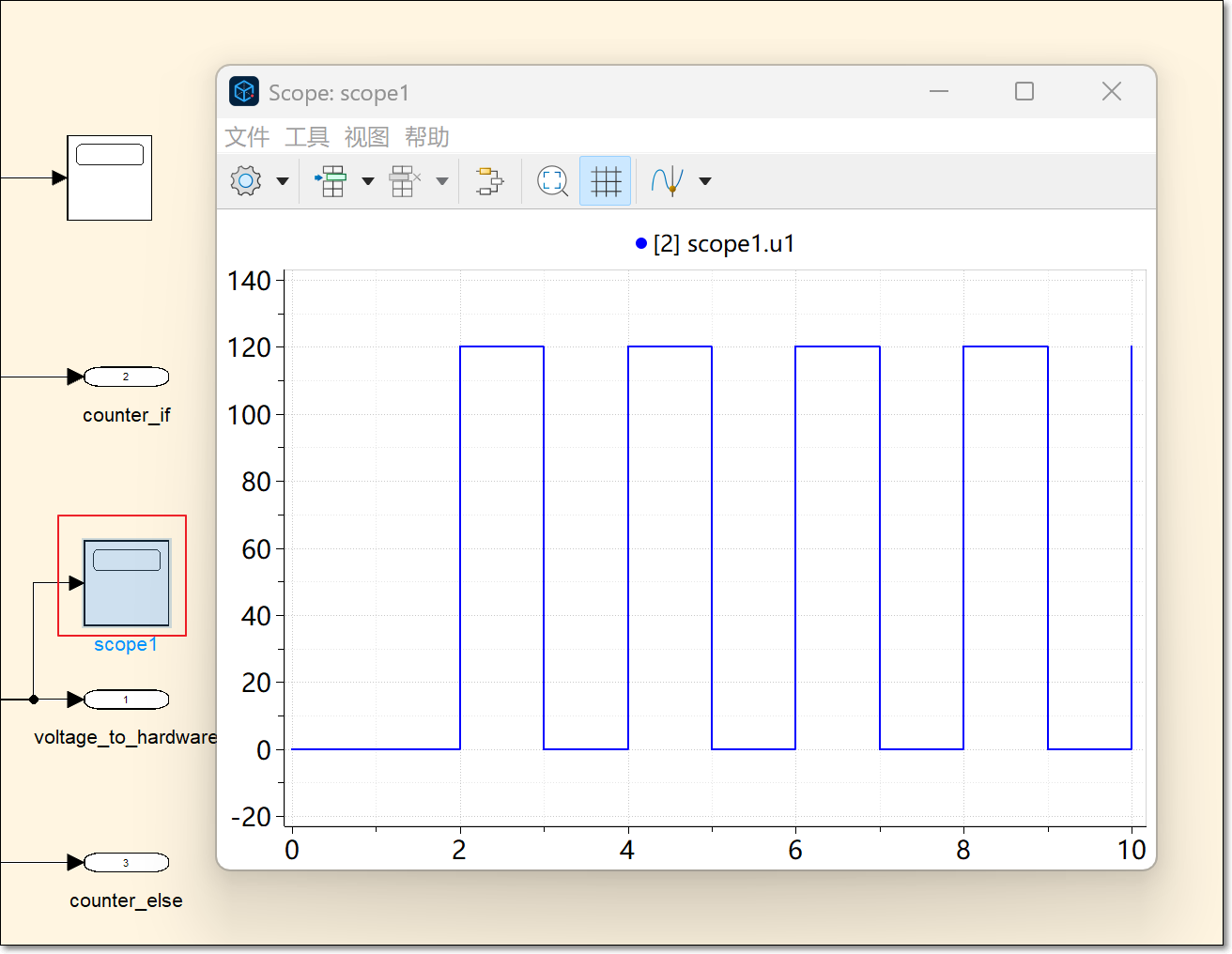 本示例展示了如何用状态机产生控制信号,并通过 If 模块选择性地激活不同的动作子系统:当 u1 为非零时开启电压并计数,否则关闭电压并计数。通过 merge 模块将分支输出统一到硬件端口,实现清晰高效的决策执行,同时便于统计各分支的运行次数。