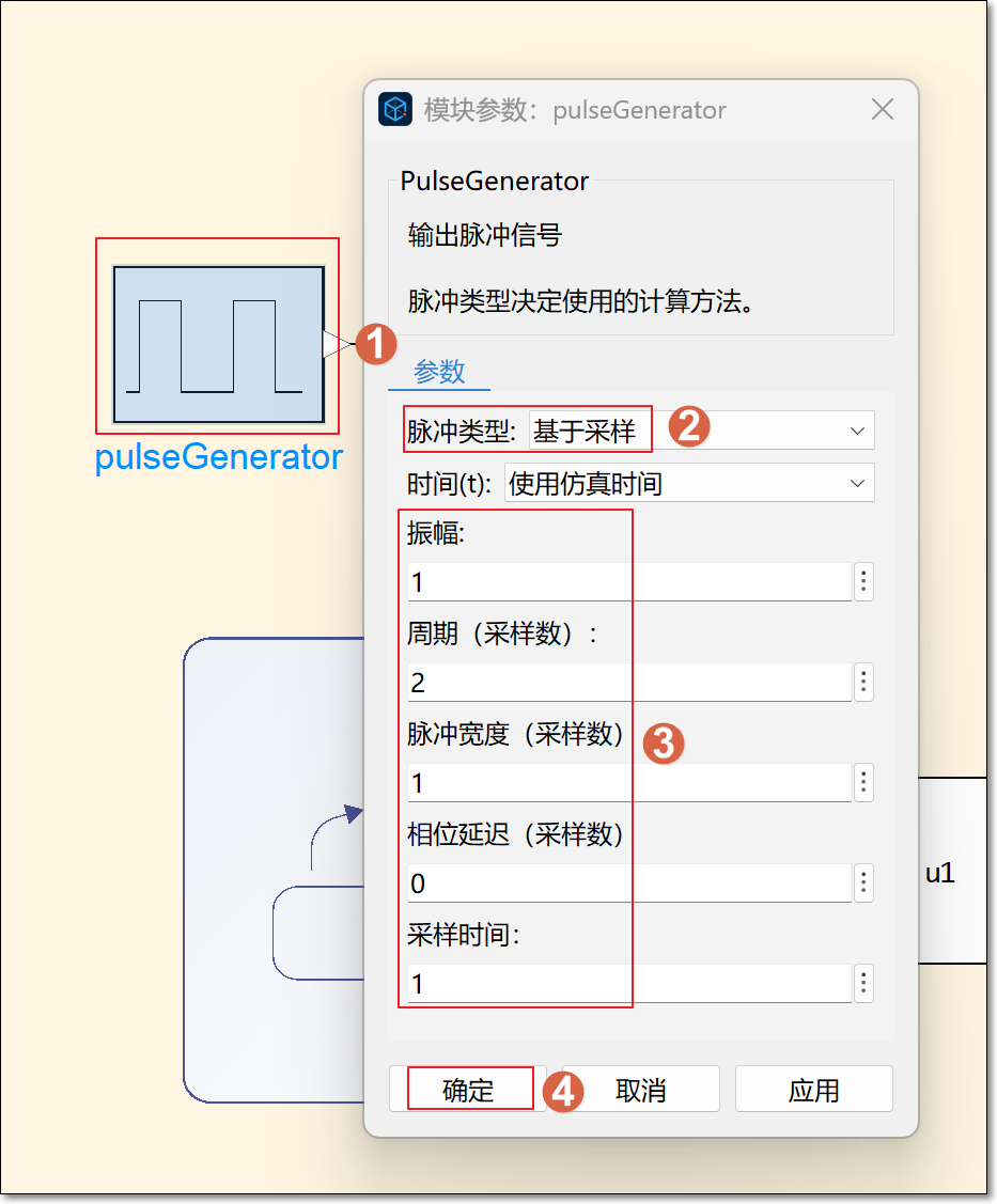 双击打开 pulseGenerator 模块,设置脉冲类型基于采样、振幅 1、周期(采样数) 2、脉冲宽度(采样数) 1、相位延迟(采样数) 0、采样时间 1,单击确定保存设置。