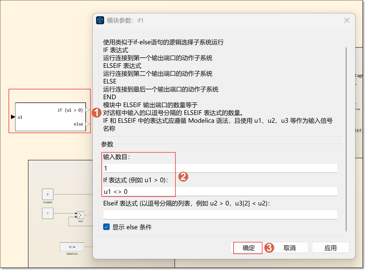 双击打开 If 模块,设置输入数目 1、If 表达式 u1 <> 0,单击确定保存设置。
