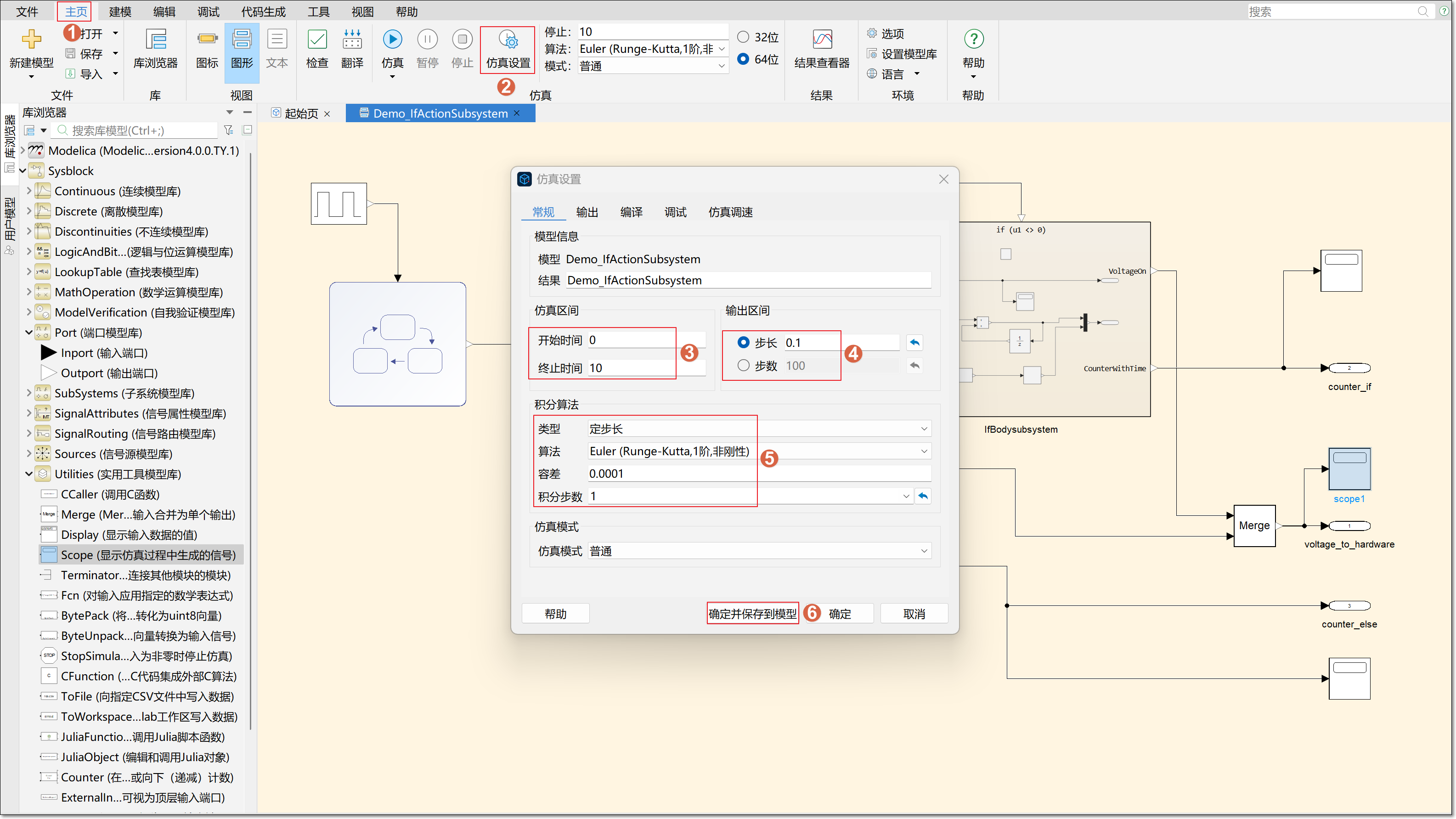 在进行仿真之前需要进行仿真设置,在软件上方功能区,单击主页 > 仿真设置按钮,打开仿真设置界面。在该界面设置开始时间 0,终止时间 10、输出区间步长 0.1。积分算法的类型设置为定步长、算法为 Euler (Runge-Kutta, 1 阶, 非刚性)、容差 0.0001、积分步数 1,单击确定并保存到模型。
